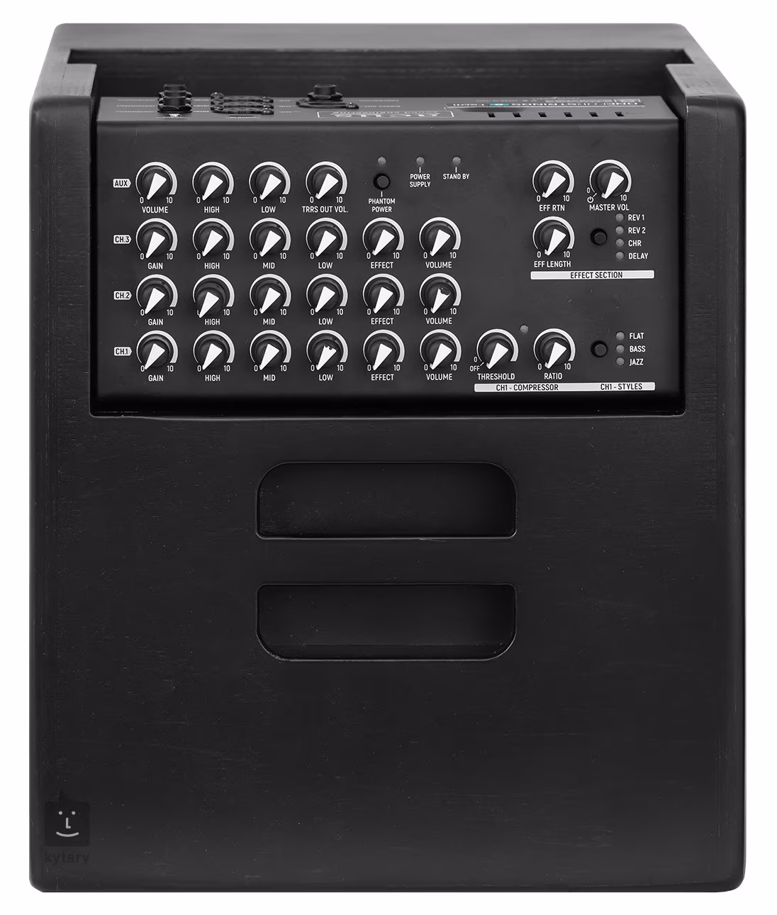 Az effekt szekció négyféle effektet kínál (Short Reverb, Long Reverb, Chorus, Delay) és lehetőséget a reverb hosszának, a chorus sebességének és a delay időnek a beállítására. Külön fejezetet érdemel az Aux csatorna Bluetooth audio in és TRRS audio in/out csatlakozókkal, amelyeknek köszönhetően az Acus OneForStrings 8 lehetővé teszi, hogy kedvenc zenéit hallgassa és játszassa telefonjáról, MP3 lejátszójáról vagy laptopjáról, valamint rögzítsen és élőben streameljen népszerű közösségi platformokon. A kombo továbbá lehetőséget kínál kondenzátor mikrofonok csatlakoztatására az opcionális fantom tápellátásnak köszönhetően, szimmetrikus XLR Direct Out kimenettel a kombo mixerhez vagy PA-hoz való csatlakoztatásához, valamint footswitch bemenettel (nem tartozék), amelyen keresztül be-/kikapcsolható a kiválasztott effekt.