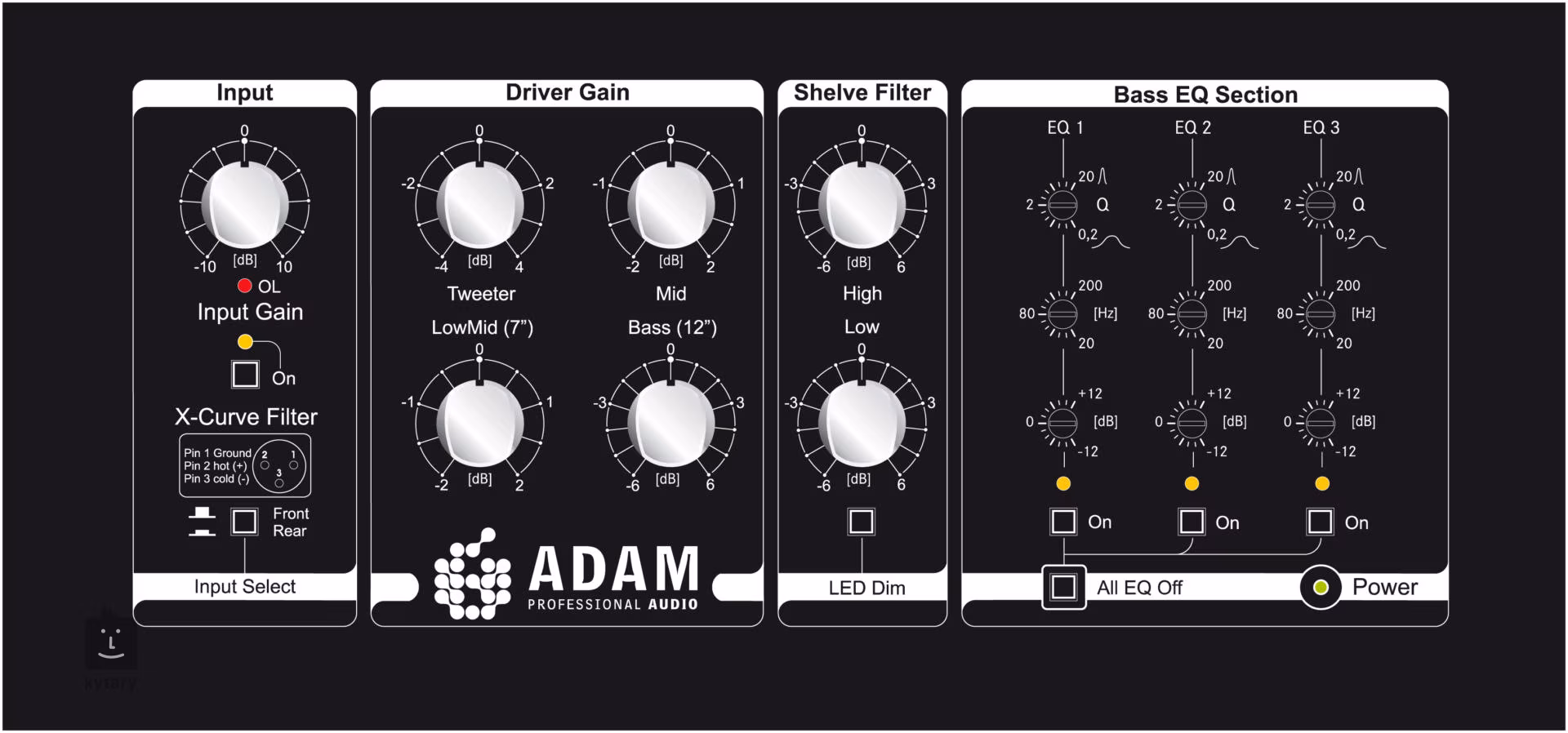Az előlapon egy nagyon kifinomult vezérlőpanelt talál az egyes monitorhangszórók erősítésének beállítására. A basszusfrekvenciák beállításához három parametrikus equalizert is talál. A hátlap ezután rugalmas csatlakoztathatóságot kínál a következők formájában.