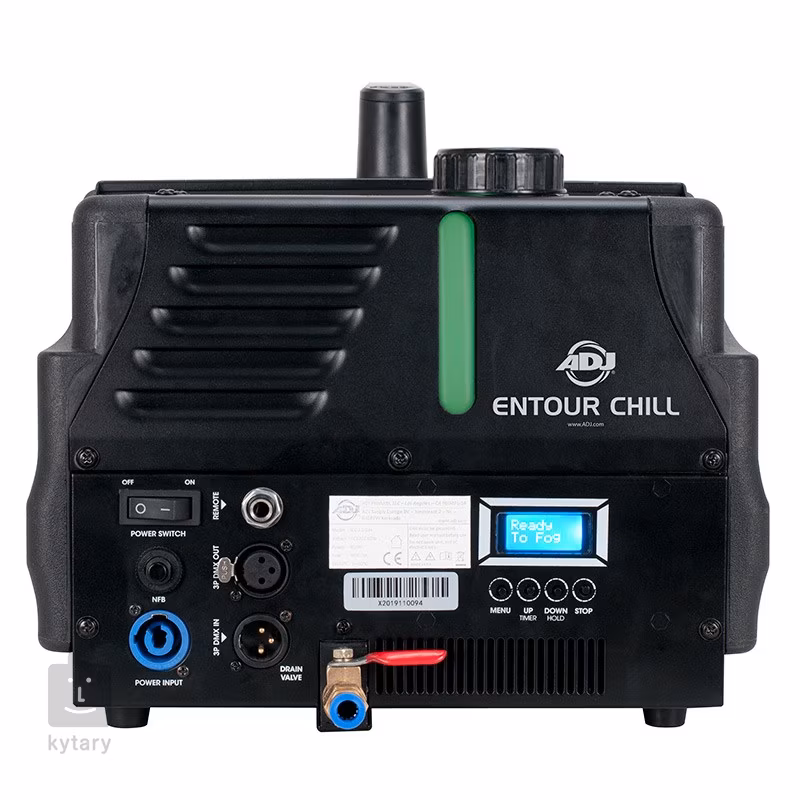 Az Entour Chill könnyen leolvasható LED kijelzővel rendelkezik, négy gombbal a gyors manuális beállításokhoz. A mellékelt ADJ FFFTR MKII vezérlővel egycsatornás DMX protokoll vagy távvezérlés is elérhető. A készülék 3pin és 5pin DMX csatlakozókkal és PowerCon AC hálózati bemeneti csatlakozóval van felszerelve. Kiváló minőségű, vízalapú ködképző folyadékot használ.