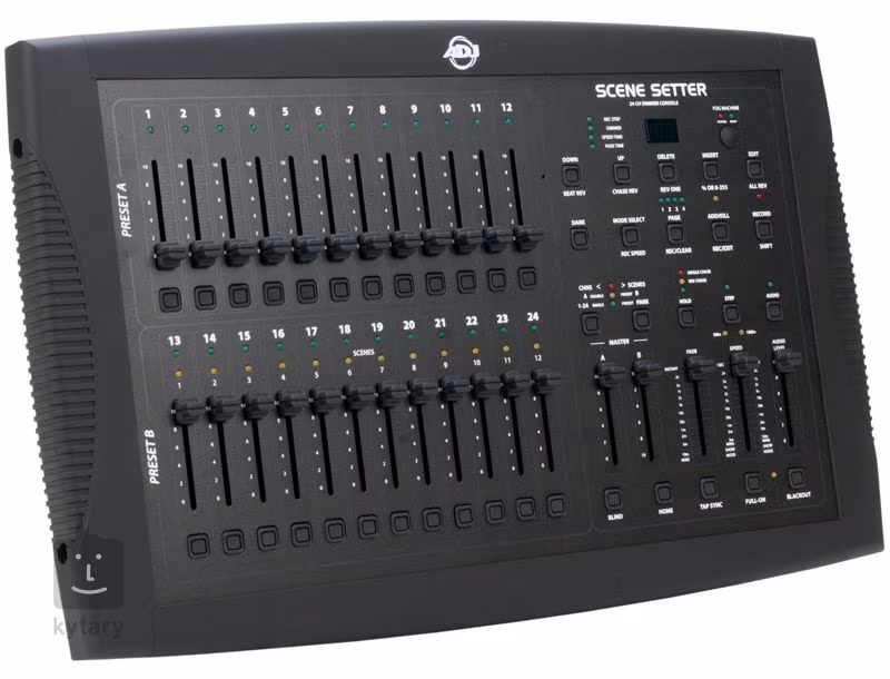 Az ADJ Scene Setter 24 egy univerzális DMX vezérlő, amely 24 DMX csatornával rendelkezik, és akár 11 000 jelenet és 48 szekvencia, vagyis chase programozására alkalmas. Minden csatorna saját faderrel és Flash gombbal rendelkezik, ami egyszerű és intuitív beállítást tesz lehetővé. A vezérlőpanel jobb oldala egyedi sebességszabályzót (Speed), Tap Sync-et a sebesség kézi beállításához, Audio gombot a fények és a hang szinkronizálásához, átmeneti szabályzót (Fade Time) vagy például az A és B jelenetek közötti váltás funkciót tartalmaz. Emellett egy világos LCD-kijelző is rendelkezésre áll, amelynek gombjaival könnyen navigálhat a menüben és válthat a módok között. A készülék hátsó paneljén egy 3 pines DMX kimenet, teljes 5 pines MIDI csatlakozó (In, Thru, Out) és USB port található. Van még egy vonali audio bemenet a fények és a zene szinkronizálásához, egy bemenet ködgenerátorhoz és egy bemenet külső távirányítóhoz. A készülék teljes tömege 4,6 kg.