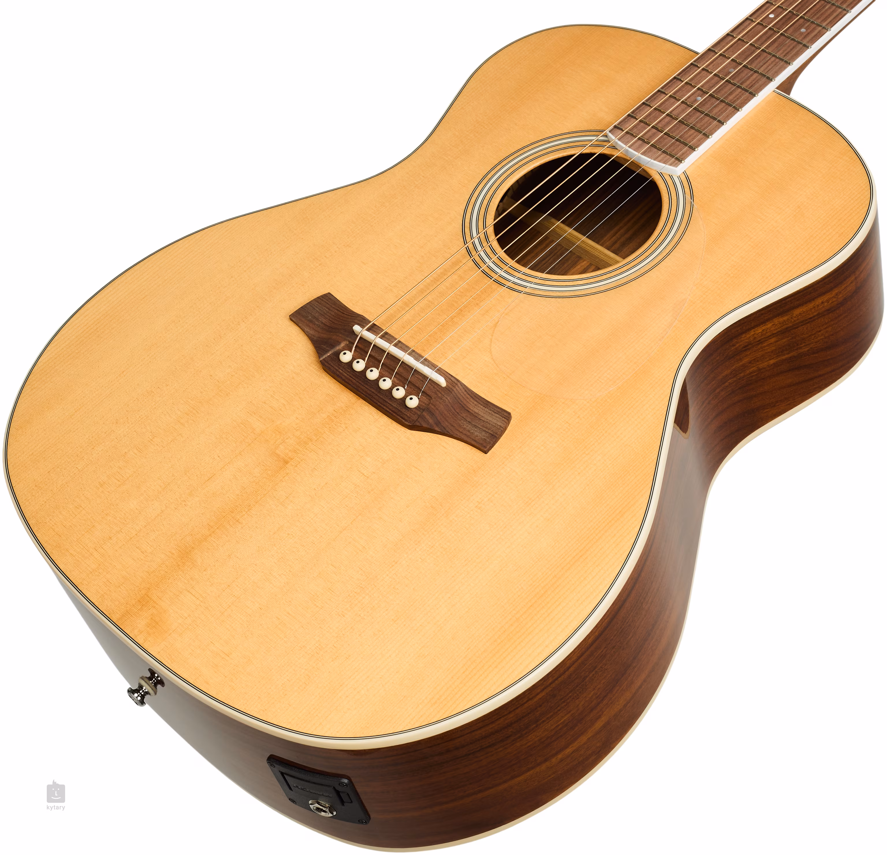 A hangosításról a Fishman Presys II elektronika gondoskodik, amely hangerő-szabályzóval, kétcsatornás ekvalizerrel, fázisinverterrel és beépített hangolóval rendelkezik. A húrok a csontból készült nulladik és nyeregcsúszdán keresztül vannak rögzítve a Grover márkájú nikkel mechanikákhoz és a pau ferro húrtartóhoz. A stílusos kivitelezést hangsúlyozza a átlátszó pickguard, a test kétoldalas szegélye, a fekete-fehér fedlap és a fekete-fehér vonalakból álló rozetta.