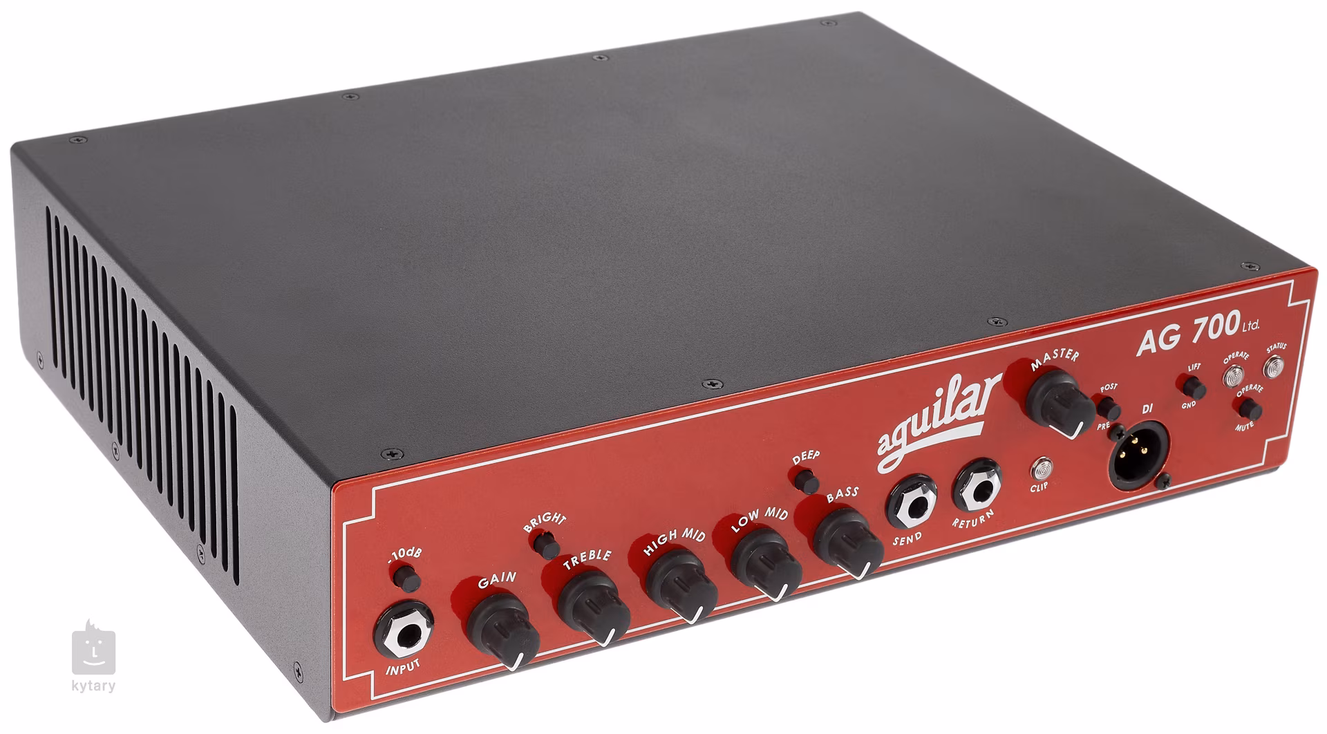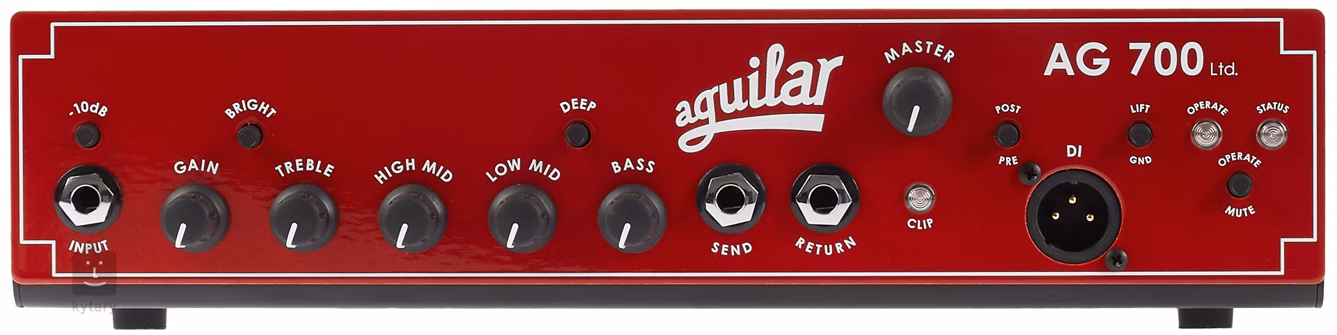 A világhírű New York-i Aguilar cég új erősítője sok basszusgitárost fog megörvendeztetni 700 W-os teljesítményével 4 ohmon és igazán könnyű, 2,2 kg-os súlyával. A fej a legendás AG 500-as erősítőn alapul, de kezelőszervei sokkal egyszerűbbek és mindenki számára elérhetőek. A bemeneten a "-10dB" gombot aktiválhatod attól függően, hogy aktív vagy passzív basszust használsz. Az ekvalizer a magas hangok, a felső és alsó középhangok és a basszus szabályzóiból áll. A Deep és Bright kapcsolók a szélesebb basszus- és magas hangtartomány erősítésére szolgálnak. A kimeneti jel csillapítására szolgáló Mute gomb jól szolgál a basszus újrahangolásához vagy cseréjéhez koncert közben. Az erősítő rendelkezik továbbá soros effekt hurokkal, szimmetrikus XLR kimenettel elő/után EQ-val és földelés kapcsolóval, valamint két Speakon hangszóró kimenettel a hátlapon.