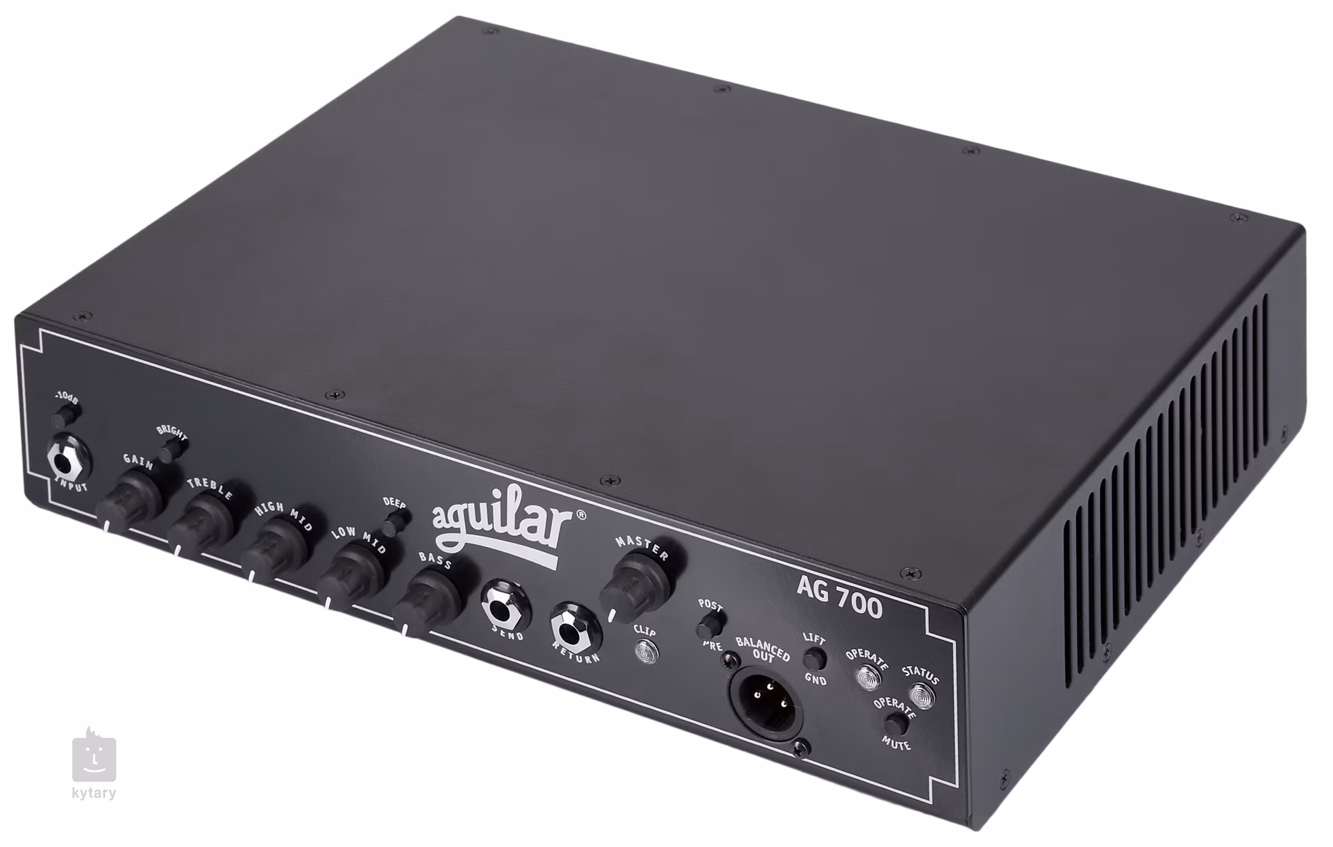 A világhírű New York-i Aguilar cég új erősítője sok basszusgitárost fog megörvendeztetni 700 W-os teljesítményével 4 ohmon és igazán könnyű, 2,2 kg-os súlyával. A fej a legendás AG 500-as erősítőn alapul, de kezelőszervei sokkal egyszerűbbek és mindenki számára elérhetőek. A bemeneten a "-10dB" gombot aktiválhatod attól függően, hogy aktív vagy passzív basszust használsz. Az equalizer a magas hangok, a felső és alsó középhangok, valamint a mélyhangok szabályzóiból áll. A Deep és Bright kapcsolók a szélesebb basszus- és magas hangtartomány erősítésére szolgálnak. A kimeneti jel csillapítására szolgáló Mute gomb jól szolgál a basszus újrahangolásához vagy cseréjéhez koncert közben. Az erősítő rendelkezik továbbá soros effekt hurokkal, szimmetrikus XLR kimenettel elő/után EQ-val és földelés kapcsolóval, valamint két Speakon hangszóró kimenettel a hátlapon.