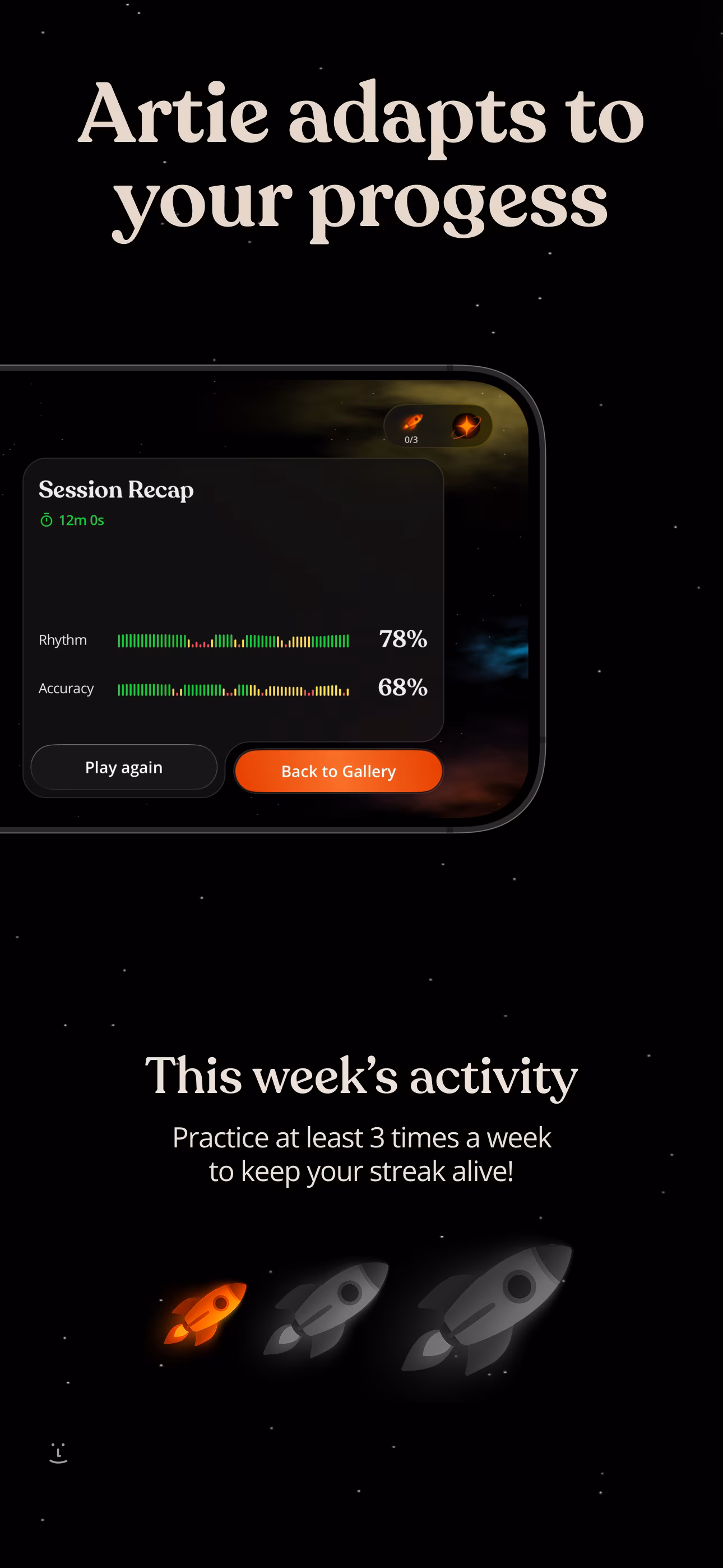 From the moment you start, Artie adapts to your pace and musical taste. Based on your playing, it creates personalized exercises and offers songs that you will enjoy from the very first minutes. While traditional online courses have a fixed structure, Artie responds to your progress immediately and naturally, encouraging regular practice and building healthy musical habits. It's no wonder that thousands of students who spend an average of more than 12 minutes a day at the piano have tried it in the first few weeks — and are indeed making rapid progress.