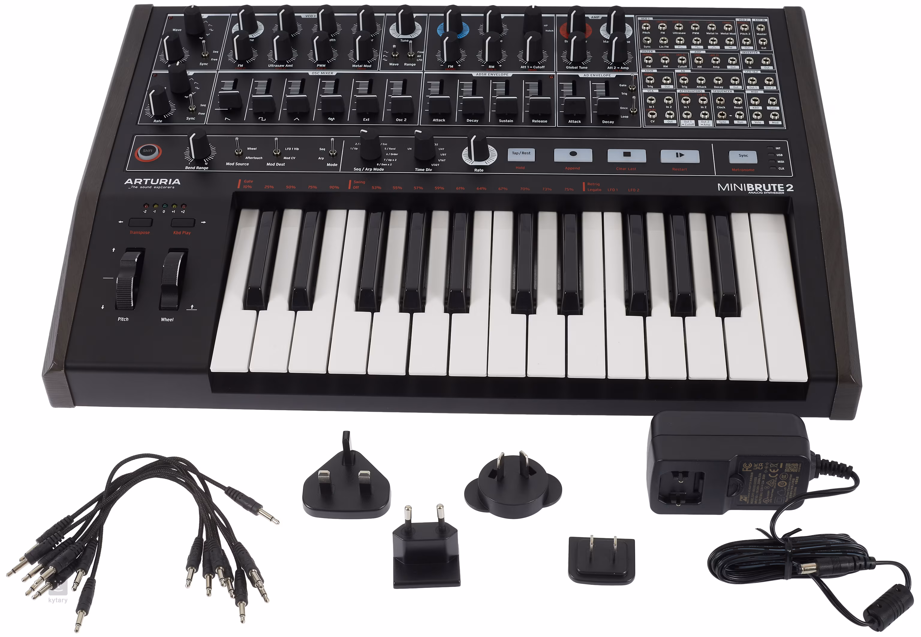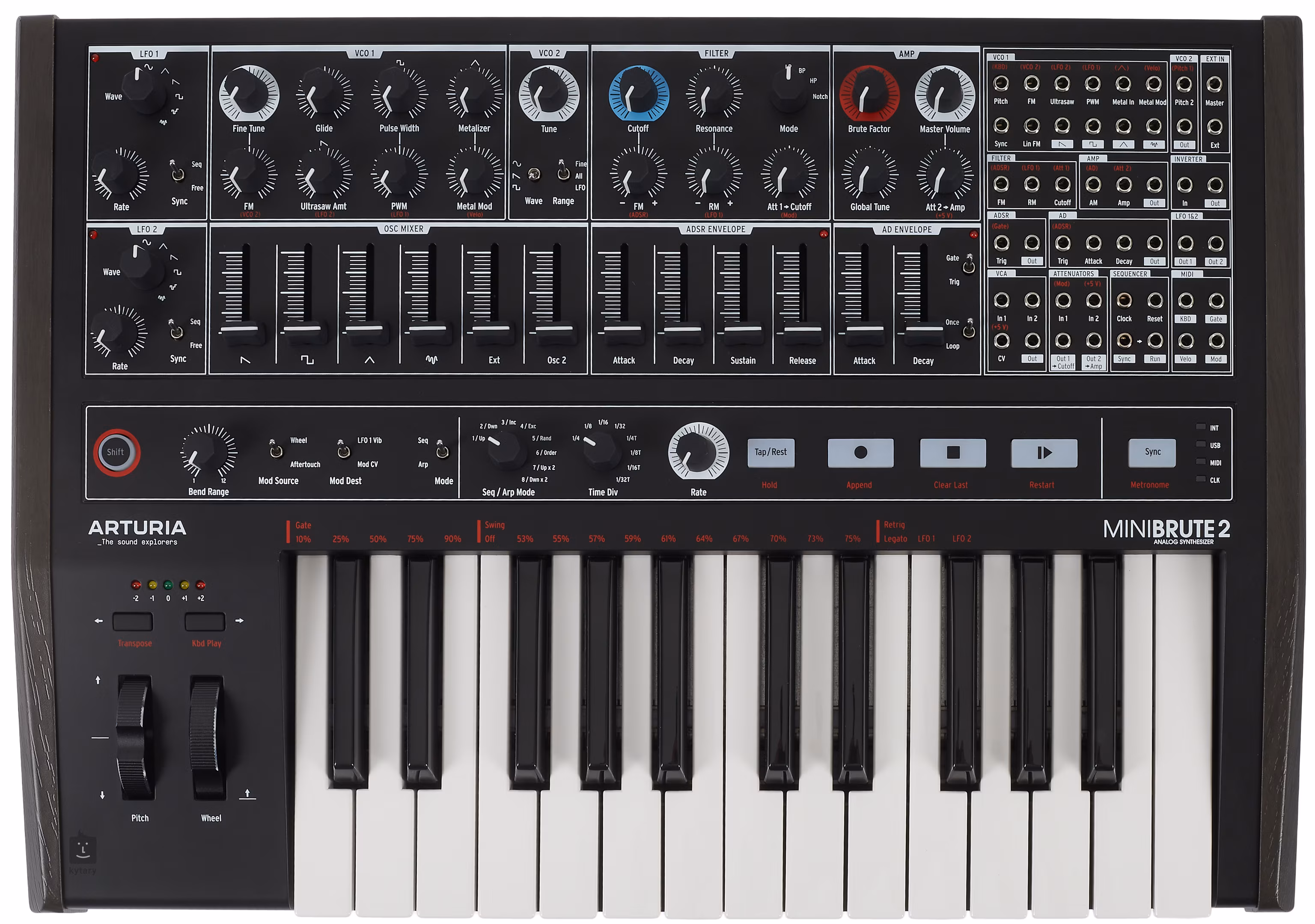 Az Arturia népszerű Minibrute analóg szintetizátora egy második oszcillátort, egy második LFO-t, új szűrő és VCO modulációs lehetőségeket, loopolható burkológörbét és ami a legfontosabb, egy hatalmas patchbay-t hoz, amely lehetővé teszi a hangzás erős modulálását mind a Minibrute 2-n belül, mind külső forrásokkal. Van beépített szekvencer, arpeggiátor, billentyűzet aftertouch vagy MIDI funkcióval és USB a DAW csatlakoztathatósághoz. A Minibrute 2 funkcionalitásában egy svájci bicskára emlékeztet, és ugyanolyan éles is lehet.