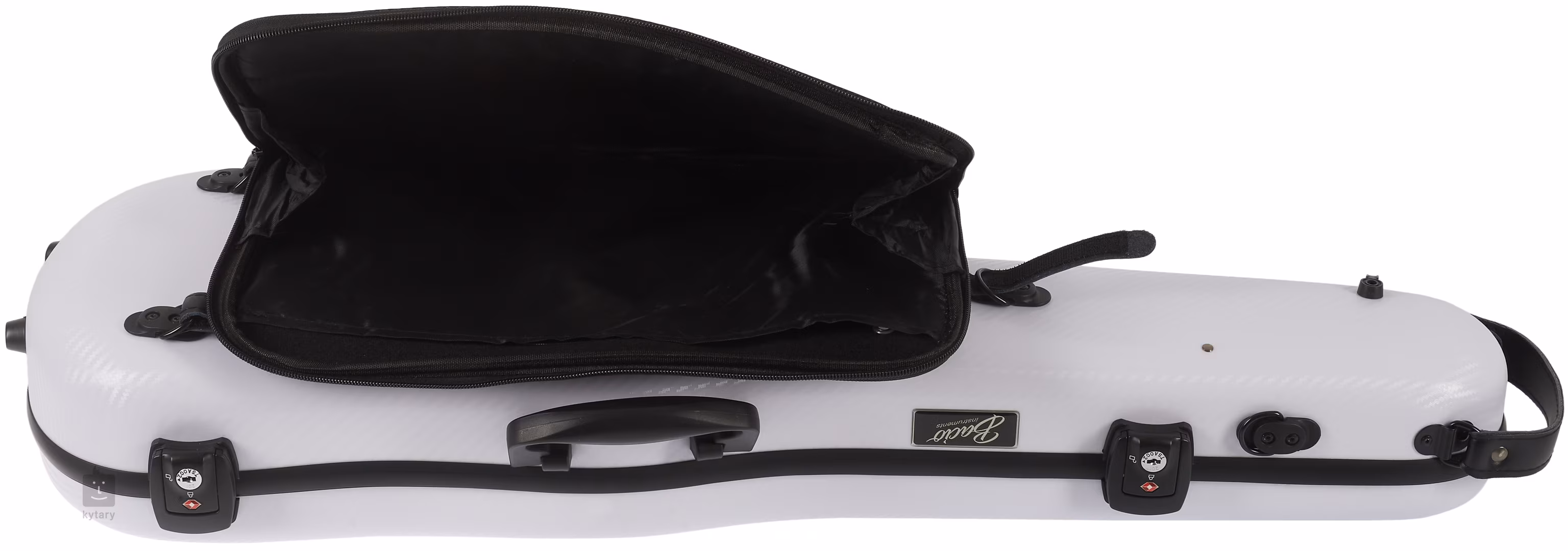 Karbon kompozit hegedűtáska két zárral és kód/jelszó feloldással, kivehető kottatartóval, fogantyúkkal az oldalán és a tetején, két vállpánttal és két vonótartóval.