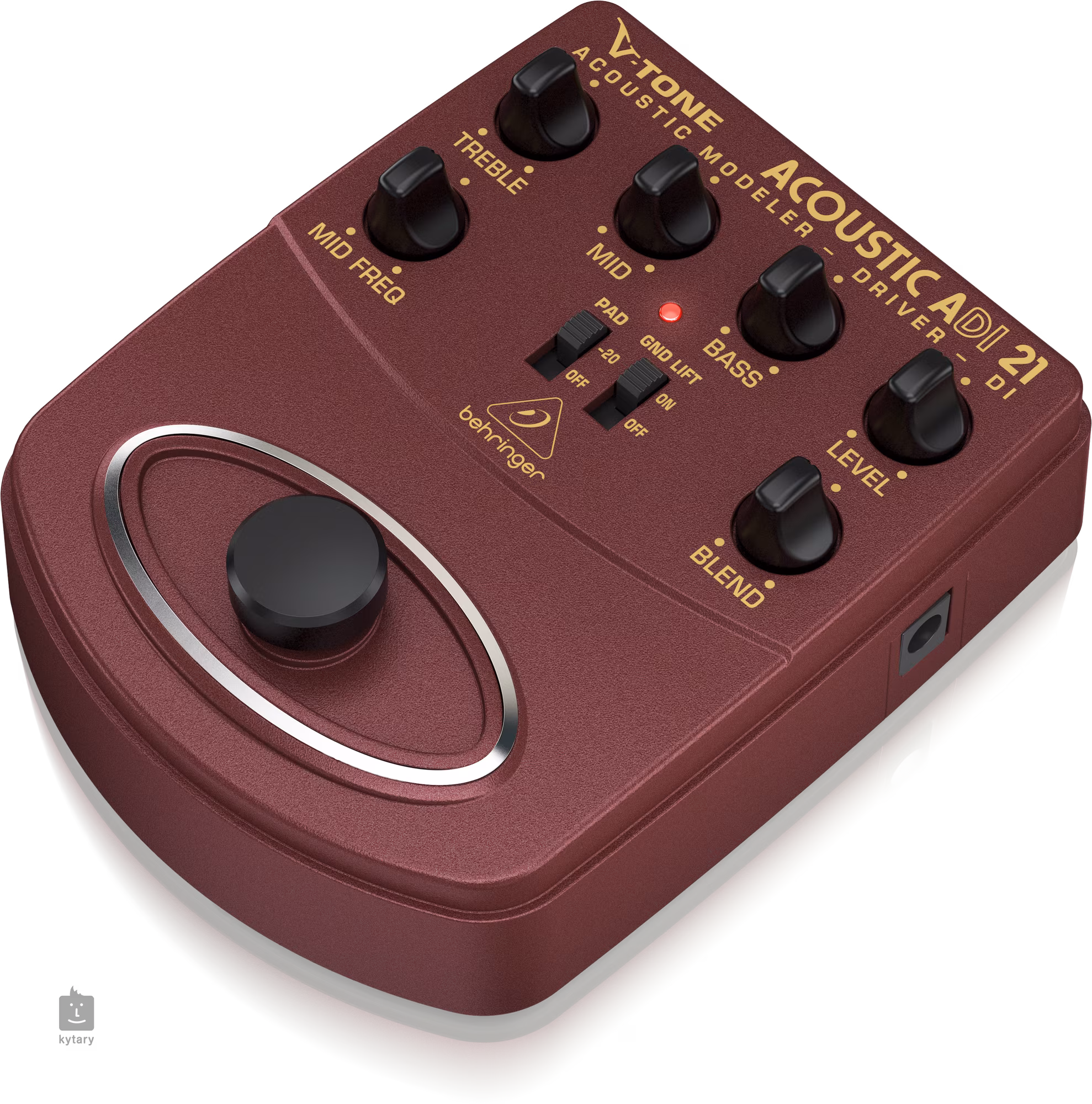 A Behringer ADI21 egy akusztikus erősítő modellező, közvetlen felvételi előerősítő és DI Box. Ez a pedál effekt képes új szintre emelni az elektroakusztikus gitár hangzását. Az ADI21 egy aktív DI-boxot kombinál cső/mikrofon emulációval - háromsávos EQ-val rendelkezik állítható középfrekvenciával és Blend szabályzóval a száraz jel arányának és a mikrofon/erősítő emulációnak a beállításához, egy mono 6,3 mm-es jack TS kimenettel és egy szimmetrikus XLR kimenettel, hogy a hangodat közvetlenül egy keverő- vagy felvételi eszközre küldhesd, -20 dB csillapítással és egy földkapcsolóval a zajszűréshez. Egyértelmű plusz, mint minden Behringer terméknél, az ár/teljesítmény arány.