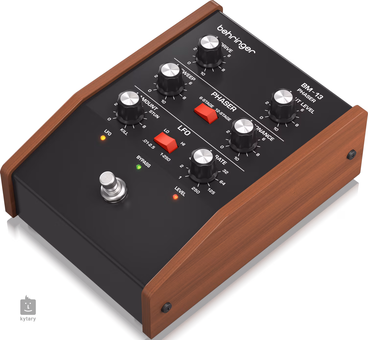 • Irányítás 1x FS, Drive, Output Level; Phaser Section: 6-Stage/12-Stage, Sweep, Resonance; LFO Section: Amount, Lo/Hi Switch, Rate