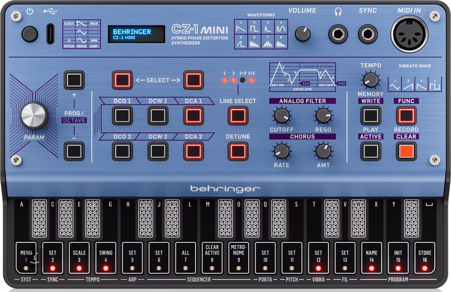 A Behringer CZ-1 MINI egy kompakt és nagy teljesítményű hibrid digitális-analóg szintetizátor, amely a legendás Phase Distortion hangszintézist kínálja, az ikonikus Casio CZ sorozat ihletésére. Modern funkciói, hordozható kialakítása és széleskörű hangalkotási lehetőségei révén ideális választás azoknak a producereknek, élő előadóknak és hangtervezőknek, akik eredeti karaktert és rugalmasságot keresnek kis méretben.
