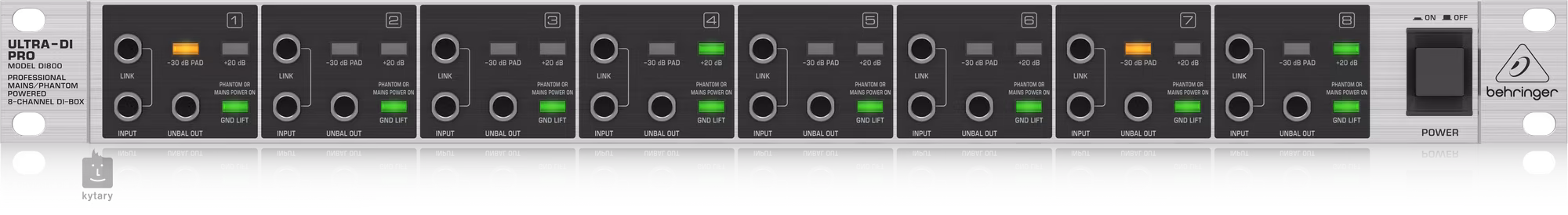 A DI-doboz bemeneti szekciója a készülék elején 8 darab 6,3 mm-es jack csatlakozóval rendelkezik, és ugyanez a kialakítás vonatkozik a Link kimenetekre is, amelyek más eszközökhöz, például a színpadi erősítőidhez és a monitorozó konzolokhoz csatlakoztathatók. A kimeneti jel kiegyensúlyozott frekvenciaválaszt biztosít, az aranyozott XLR kimeneti csatlakozók pedig megbízható, alacsony zajszintű működést biztosítanak. A jack 6,3 mm-es kimenetek nem szimmetrikus csatlakozásban is rendelkezésre állnak. Az egyes csatornák földeléskapcsolói kiküszöbölik a földhurok zümmögési problémákat. A DI800 mindent tud, amit egy önálló passzív DI tud, és még többet is! Nyolcszoros.