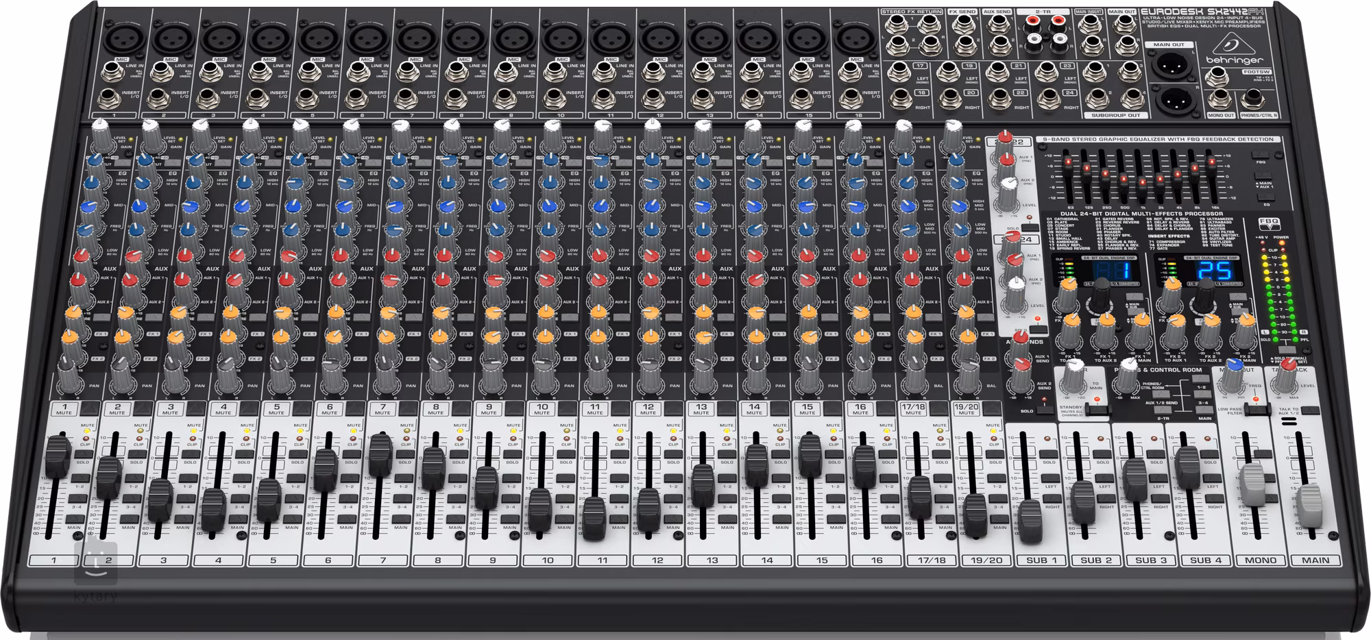 A Behringer SX2442FX analóg keverőpult ideális stúdióhasználatra és élő rendezvényekre egyaránt. Összesen 24 csatornát kínál, amelyek közül tizenhat XLR mikrofonbemenettel rendelkezik kiváló minőségű XENYX előerősítőkkel (kondenzátor mikrofonok használatához globális fantomtáp áll rendelkezésre), valamint 6,3 mm-es Jack TRS vonalbemenetekkel és insert (be/ki) csatlakozókkal. A fennmaradó nyolc csatorna mono bemenetek párja, amelyek együttesen sztereó jelet eredményeznek (17/18, 19/20, 21/22 és 23/24). Ezek a csatornák billentyűs hangszerek, szintetizátorok, elektromos dobok vagy külső hangforrások hangosítására alkalmasak.