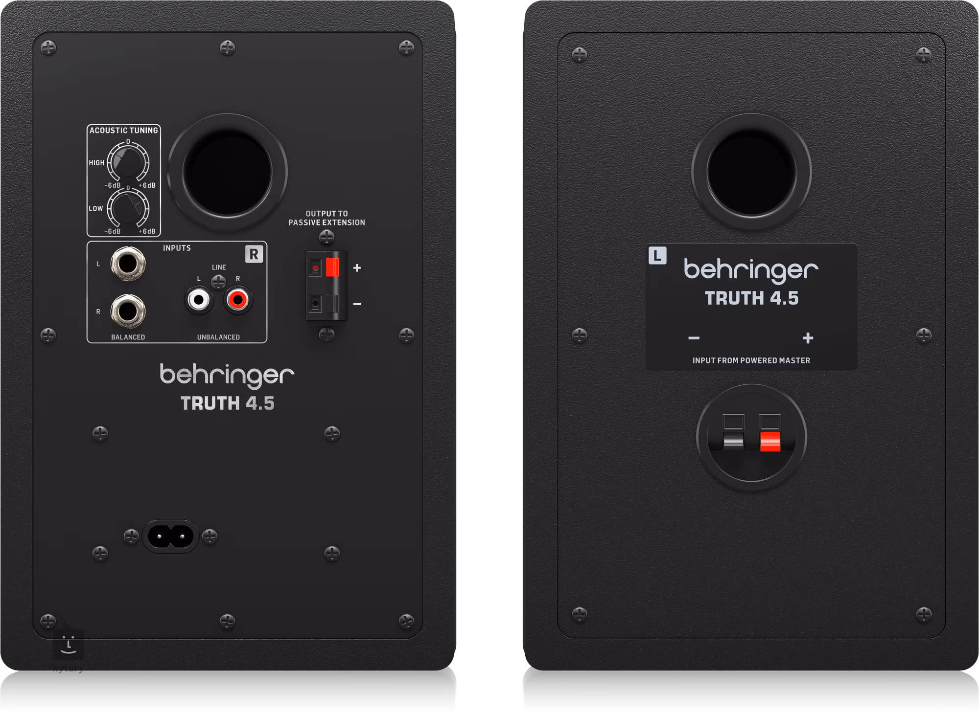 A Behringer TRUTH 4.5 rendszer 2 x 32 W-os bi-amp erősítővel van felszerelve, ahol minden hangszóróhoz saját teljesítményt rendelnek, így biztosítva a minimális torzítást és a részletesebb hangvisszaadást. Bármilyen eszközt csatlakoztathat a hangszórókhoz, akár szimmetrikus jelekkel az RCA cinch csatlakozókra, akár szimmetrikus kábelekkel a 6,3 mm-es TRS jack csatlakozókra. Kisebb fogyasztói eszközök gyors csatlakoztatása az előlapon található AUX bemeneten (3,5 mm-es sztereó jack) keresztül lehetséges. A hangpreferenciák pontosabb beállításához potméterek állnak rendelkezésre az élsáv-korrekciók (magas/alacsony) beállításához, és arra a pillanatra, amikor nem akar senkit sem zavarni, használhatja az előlapon található fejhallgató-kimenetet (3,5 mm-es jack). A kimeneti hangerő a hangerőszabályzó kerékkel szabályozható.