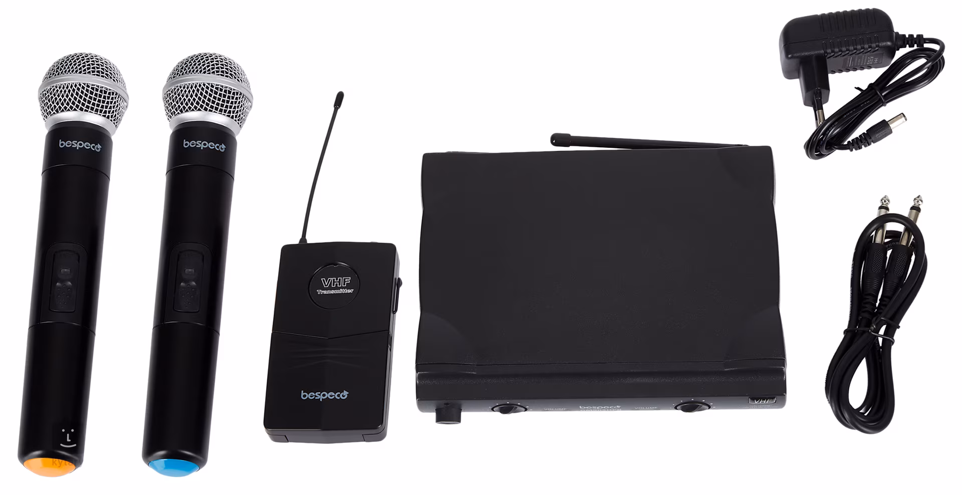 Két dinamikus kézi mikrofont tartalmazó, VHF rendszerű, vezeték nélküli kettős szett, amely alkalmas műsorvezetők, karaoke partik vagy élő énekes előadások számára.