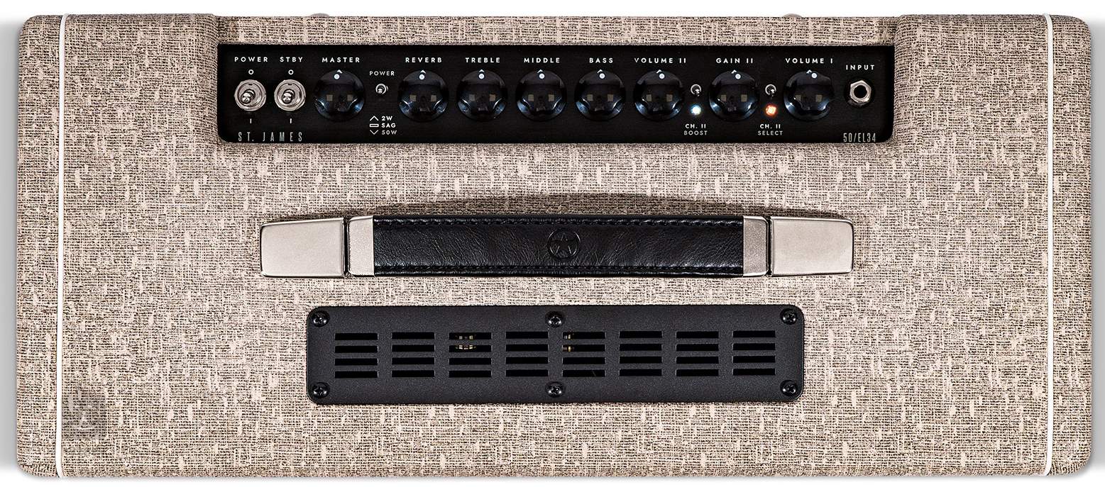 A St. James 50 EL34 Combo egy kétcsatornás lampás kombo, hagyományos brit rock hangzással és kiváló tiszta hangszínnel, amely az amerikai márkák erősítőinek jellegzetességeit hordozza. A fő panel klasszikus elemekkel rendelkezik, mint például háromsávos ekvalizer, hangerő- és gain-szabályzók, beépített reverb effekt és Boost kapcsoló, amellyel a második csatorna két hangzása között lehet váltani (a mellékelt lábkapcsolóval is).