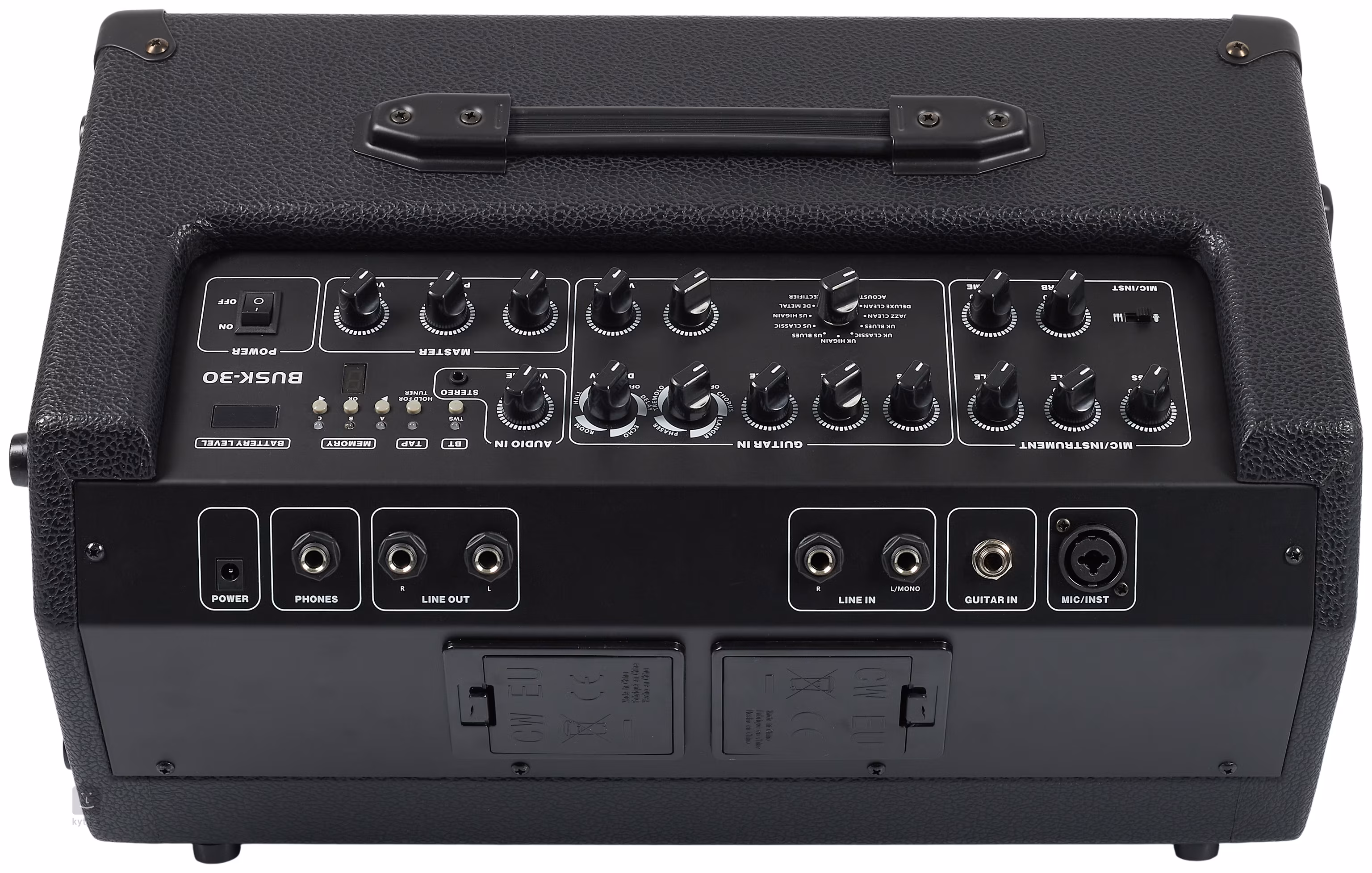 A megfizethető Blond BUSK-30 gitármodellező kombo már a nevéből is egyértelmű. 30 W-os teljesítményével, két csatornájával (gitár és mikrofon), az akkumulátoros táplálási lehetőséggel és a Bluetooth-kompatibilitással ideális társ az elektromos gitárral kísérő dalszerzők és utcazenészek számára.