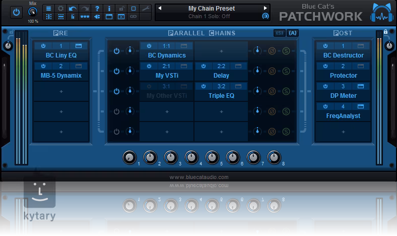 A Blue Cat Audio Patchwork egy rendkívül intuitív eszköz, amely alkalmas a VST hangszerek vagy effektek soros és párhuzamos összekapcsolására akár nyolc független láncban, hogy az audio- és MIDI-jeleket több eszköz között ossza meg minimális késleltetéssel és jelveszteséggel. A bővítmény egy áttekinthető műszerfalat tartalmaz, ahol beállíthatja a bemeneti és kimeneti jeleket, beleértve az elő- és utóhúrokat is. A Patchwork biztosan használható stúdiómunkákhoz és élő előadásokhoz egyaránt.
