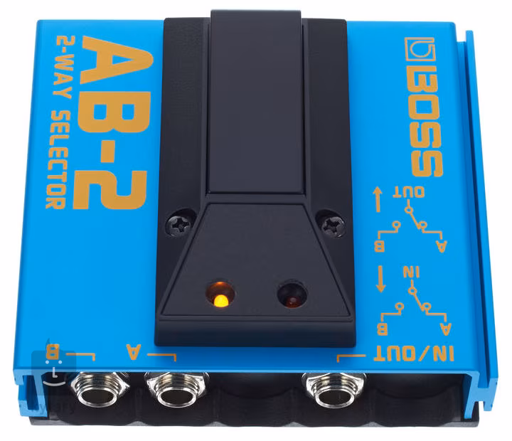 A Boss AB-2 egy egyszerű jelkapcsoló. A kapcsoló megnyomásával választhat az A és B csatornák között. Előnye a megfordítható használat, lehetővé teszi, hogy egy hangszer jelét két erősítőre küldje, vagy fordítva a jelet két hangszerről egy erősítőre, vagy váltson a hangszer és a hangoló között. A kapcsoló két AAA elemmel működik.