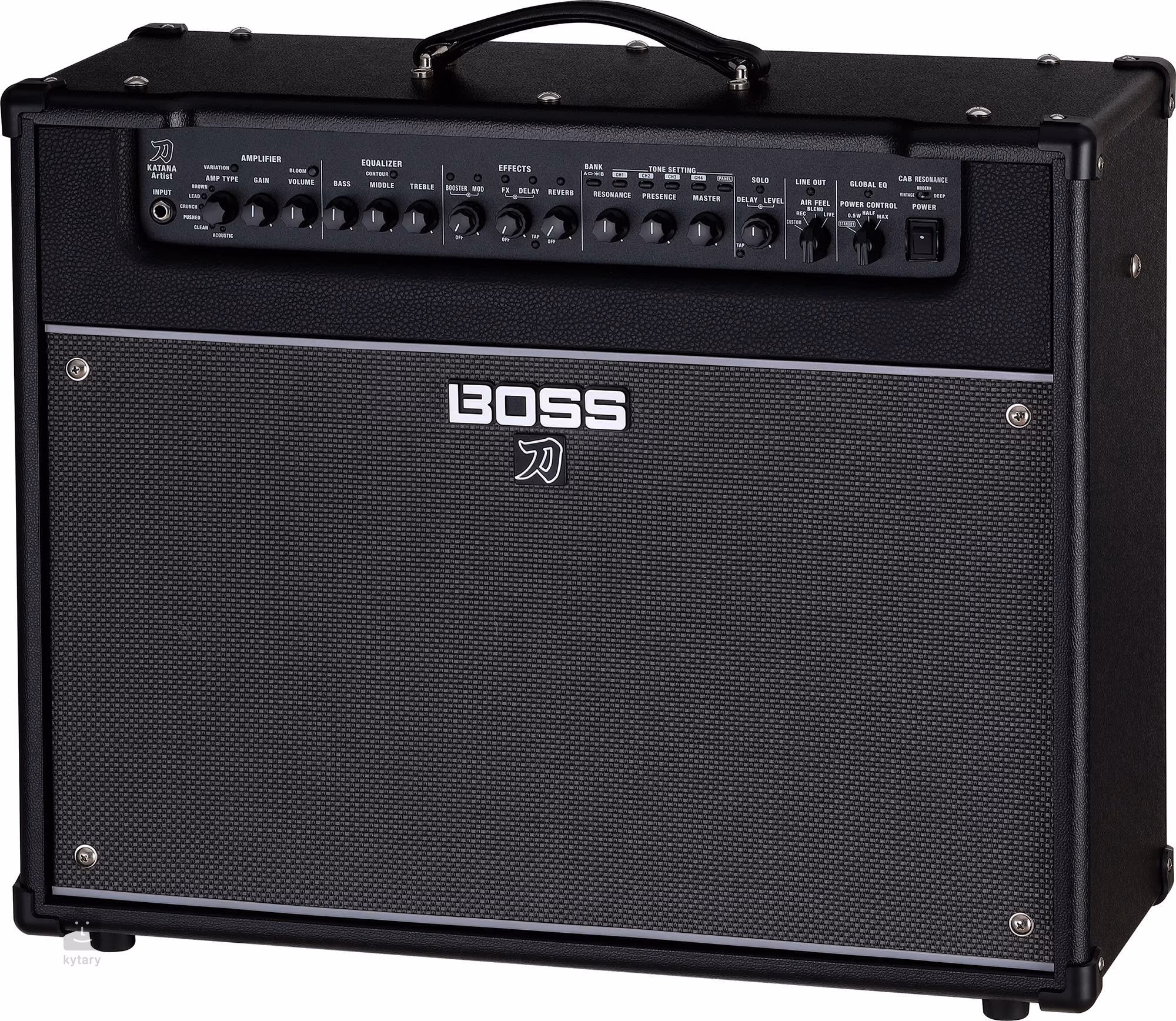 A Boss Katana Artist Gen 3 egy 100 wattos teljesítményű gitár hibrid kombó. A Power Control funkciónak (100W, 50W, 0,5W) köszönhetően szobahangerőn is élvezheted a gép "felrúgott" hangzását és megszólalását. A géphangok széles skáláján belül könnyen megtalálhatja a sajátját - akár az oldies retro hangzások, akár a modernebb hi-gain, akár az elektro-akusztikus gitárokhoz optimalizált hangzást keresi. Az effektegység összesen tizenöt effektet kínál öt kategóriában (Booster, Mod, FX, Delay, Reverb), és mind az öt effektcsoportot egyszerre használhatod, így teljesen kiválthatod a dobozokat a pedálpadodon. A BOSS Tone Studio szoftverhez csatlakoztatva még tovább mehet - több mint 60 különböző effekt-típussal testre szabhatja a szekciókat, megváltoztathatja az effektek sorrendjét a húrokban és még sok minden mást.