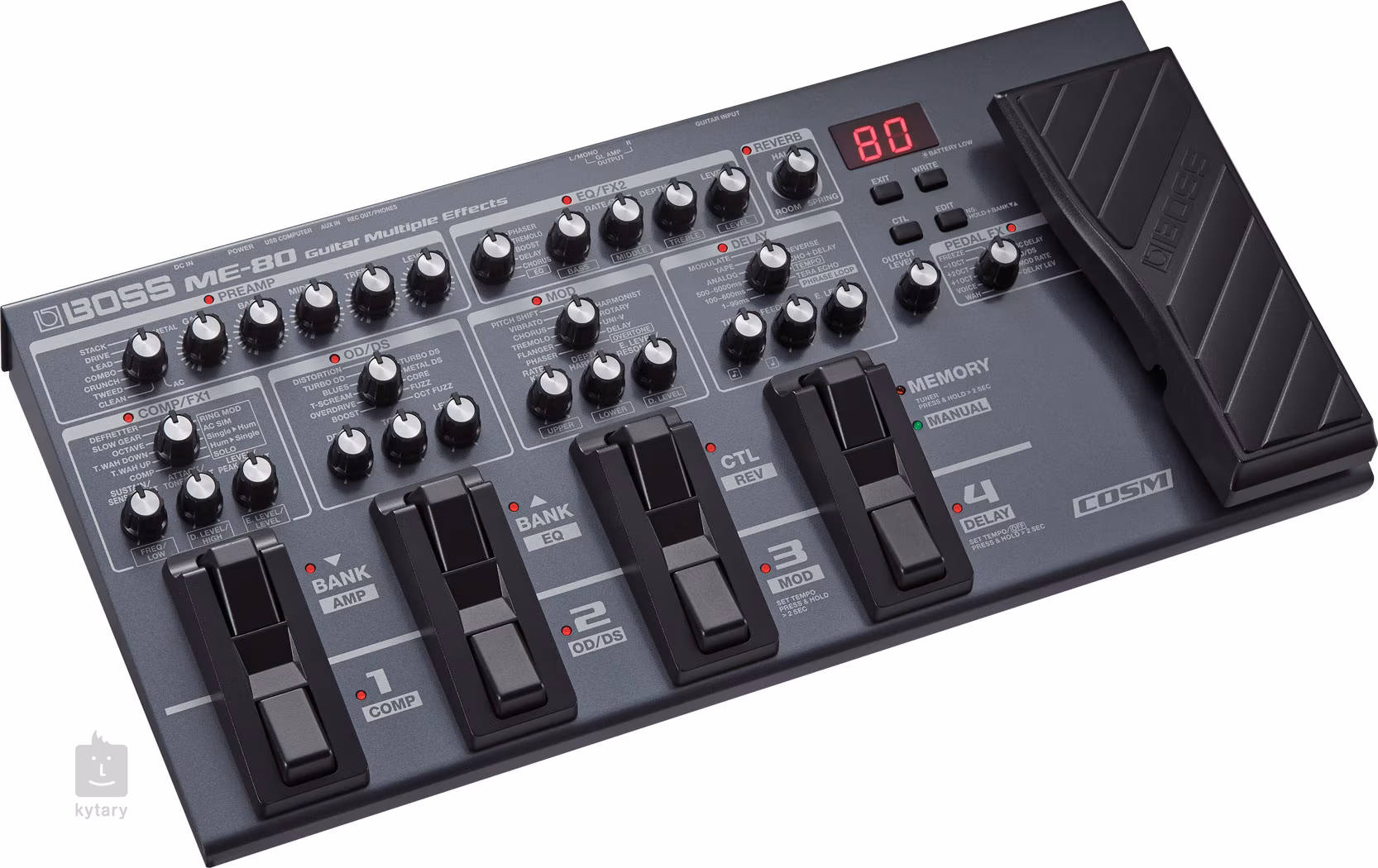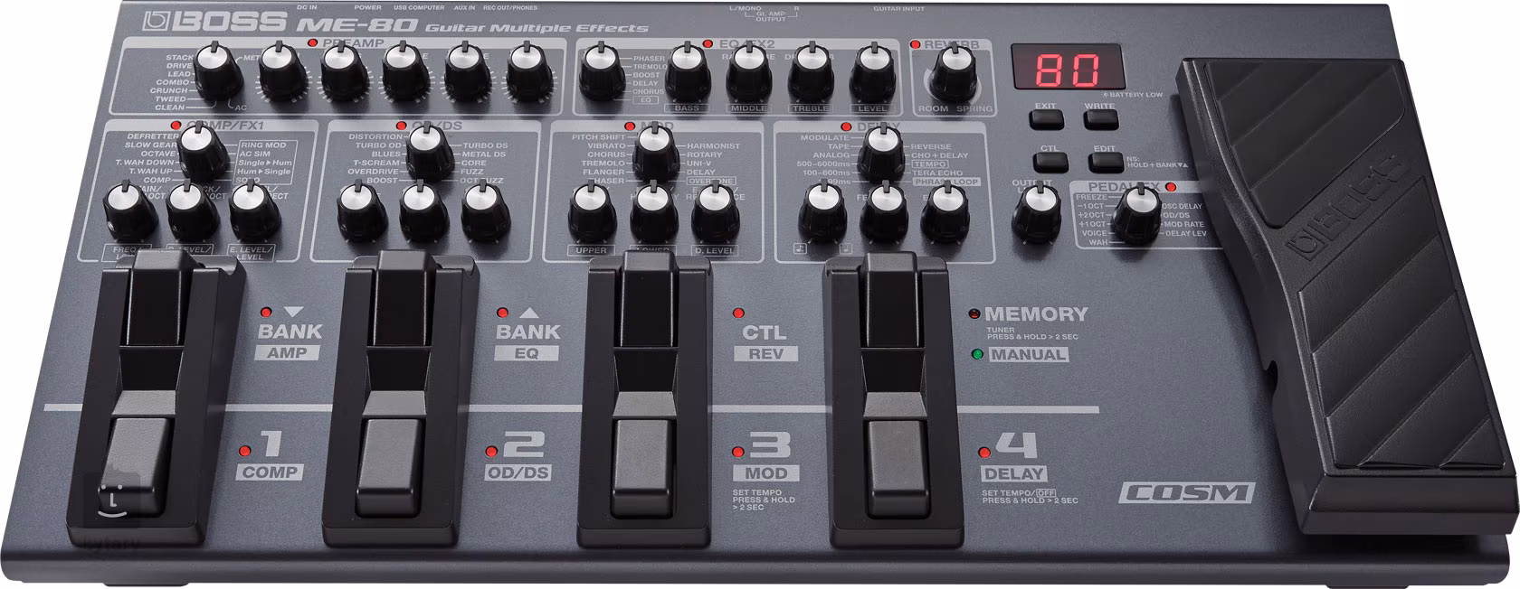 A Boss ME-80 egy professzionális gitár multieffekt, amely tisztaságot, könnyű kezelhetőséget és egyszerűséget kínál a hangok széles választéka mellett. Hangkönyvtárával több tucat kiváló minőségű effekthez férhet hozzá, amelyek a többi Boss multieffekthez hasonlóan a népszerű COSM modellezési technológiát használják, hogy a lehető legjobban utánozzák a modellként állt effekteket, erősítőket és hangszórókat.