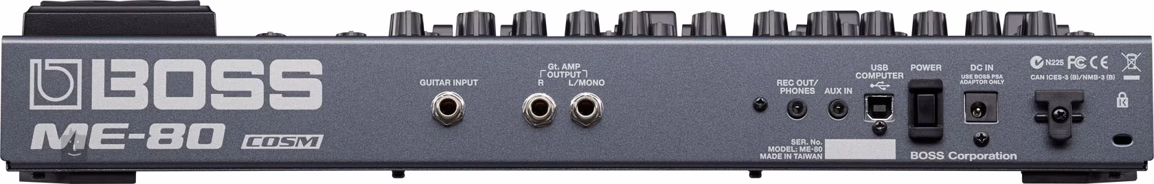 A multieffekt vezérléséhez 8 lábkapcsolót és egy pedált használhatsz a wah-wah vagy a hangerő effektek és egyéb paraméterek vezérlésére. Mindegyik hangszekciónak saját vezérlője van. Az effekt hátulján a bemenet és a sztereó kimenet mellett egy jack csatlakozó található külső eszközök, például CD- vagy mp3-lejátszók csatlakoztatására, valamint egy fejhallgató kimenet. Az USB-interfész lehetővé teszi, hogy az ME-80-at a számítógépen/laptopon lévő DAW-hez csatlakoztassa, a szerkesztőprogramban (ingyenesen letölthető a Boss weboldaláról) szerkessze a hangkészleteket, és még a MIDI-ben adott parancsokra és változtatásokra is reagáljon.