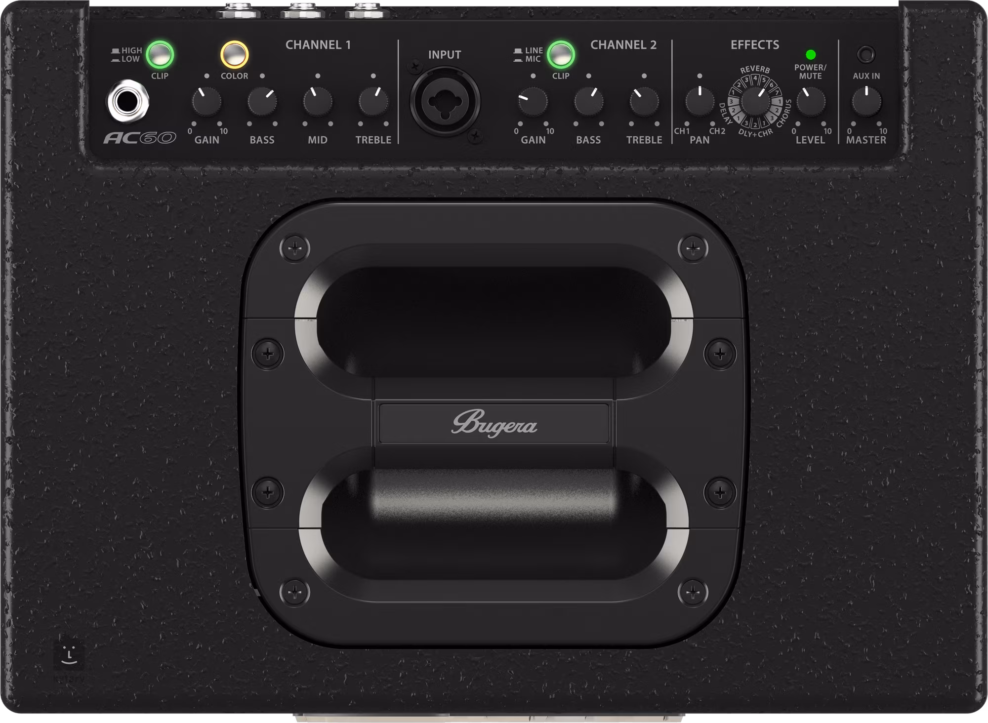 A Bugera AC60 egy hordozható 60 wattos kétcsatornás akusztikus kombó, amely alkalmas énekesek számára, akik akusztikus gitáron vagy más akusztikus hangszereken kísérik magukat. Két külön csatornával rendelkezik, független hangerő- és EQ-szabályozókkal, egy átkapcsolható mikrofon/vonalas második csatornával dinamikus és kondenzátor mikrofonok (48V-os fantomtáp) és vonalszintű hangszerek használatára, valamint egy Klark Teknik effektprocesszorral 24 bites felbontással és 16 reverb, delay és chorus effektekkel.