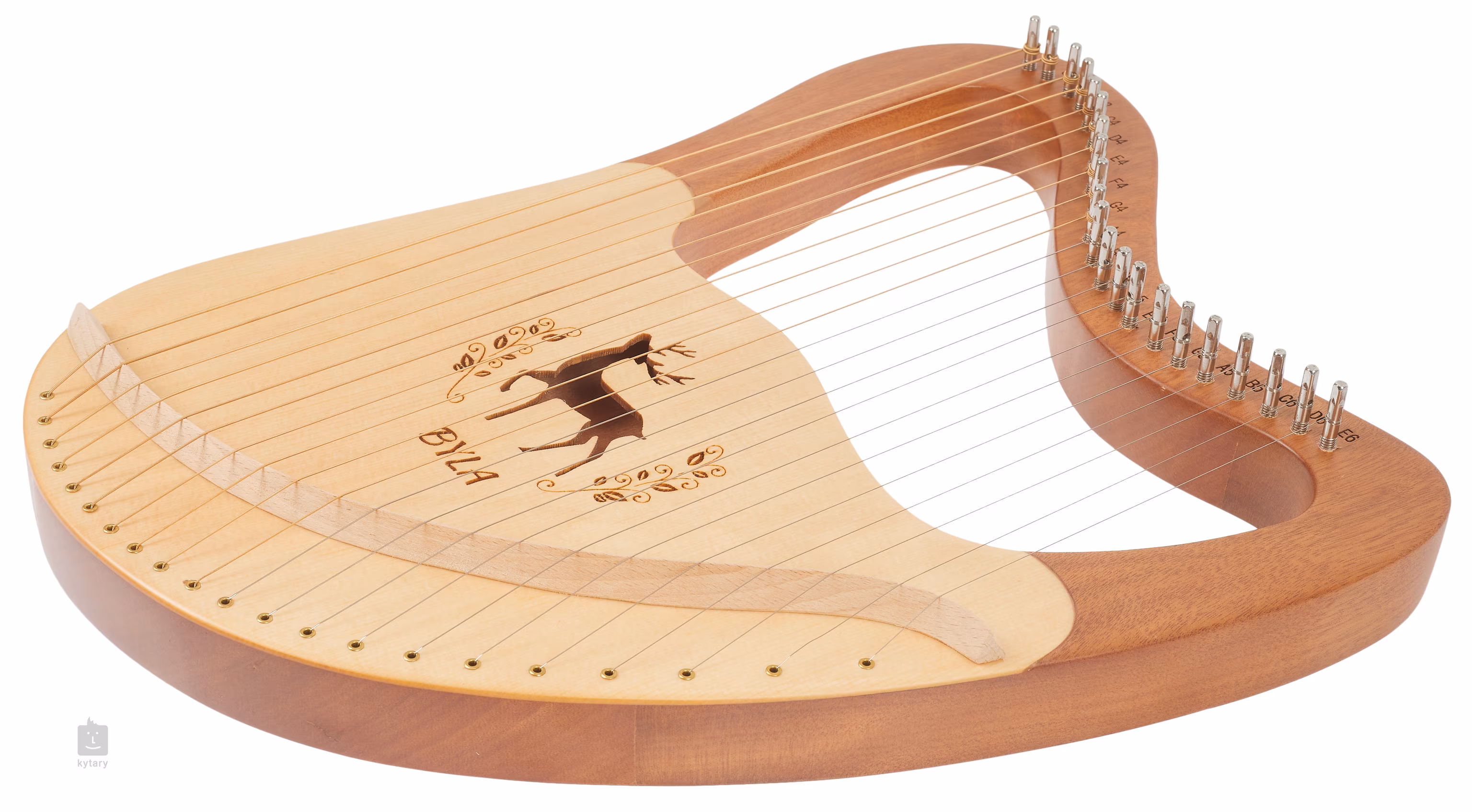 A Lyra BLH21C-T kávé színű, huszonegy húrral rendelkezik, és a hanglyuk körül szarvas alakú faragvány díszíti.