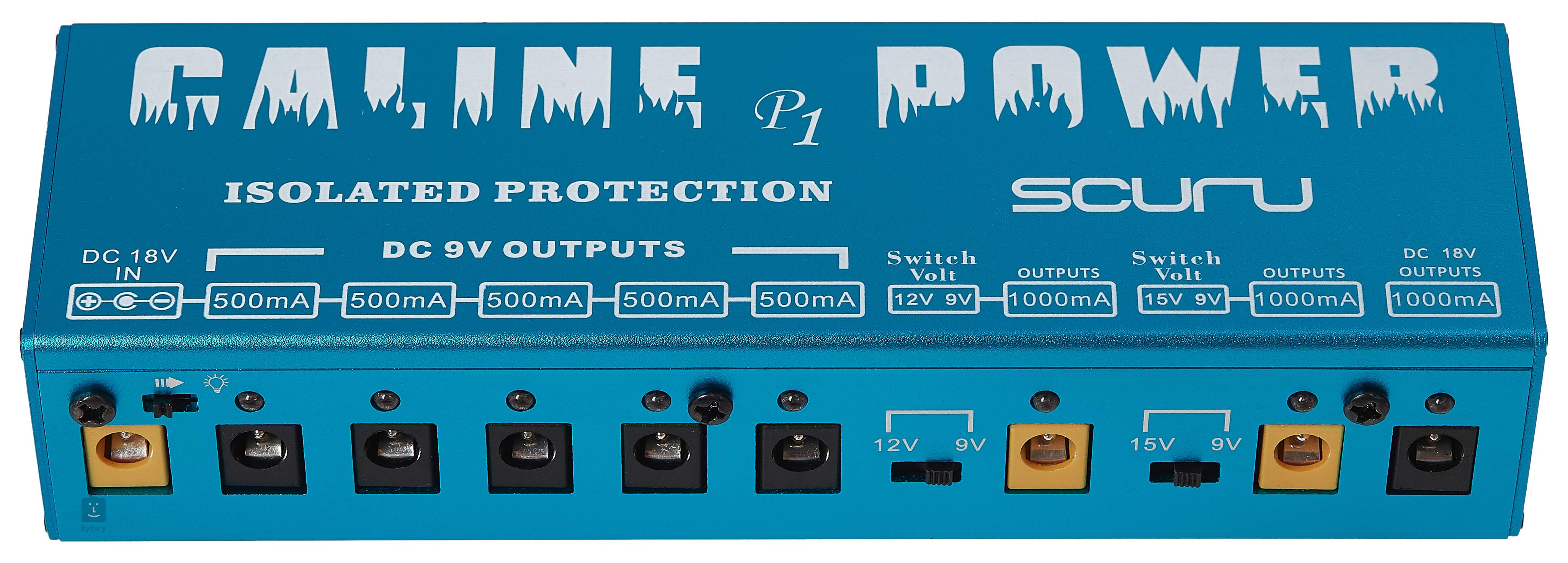 A Caline P1 Scuru multiadapter összesen nyolc kimenetet kínál egy tartós alumínium házban, hogy túlfeszültség-védelemmel táplálja a gitáreffekteket. Öt 9 V-os kimenettel (500 mA), két kapcsolható feszültségű kimenettel (9/12 V, 1000 mA és 9/15 V, 1000 mA) és egy 18 V-os kimenettel (1000 mA) rendelkezik.