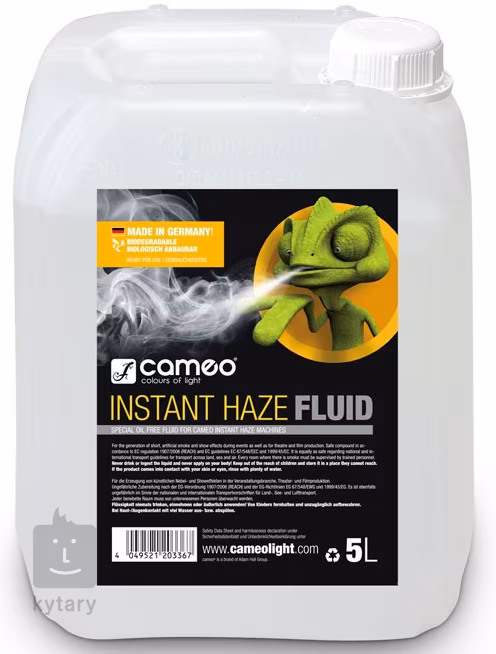 A CameoInstant Haze Fluid 5L-t kifejezetten az Instant Hazer termékcsaládhoz tervezték. Ez egy professzionális, vízbázisú patron, amely finom ködöt termel, hosszú eloszlási idővel. A folyadék környezetbarát, nem mérgező, nem veszélyes és biológiailag könnyen lebomló. A patron előállításához használt vizet 10-szer desztillálták, így biztosítva, hogy a patron maradéka nem képződik a készülékben, többszörösen meghosszabbítva a berendezés élettartamát. Nem hagy nyomot vagy foltot, és teljesen szagtalan. Ideális a legtöbb elterjedt hazerhez. A folyadék azonnal felhasználható.