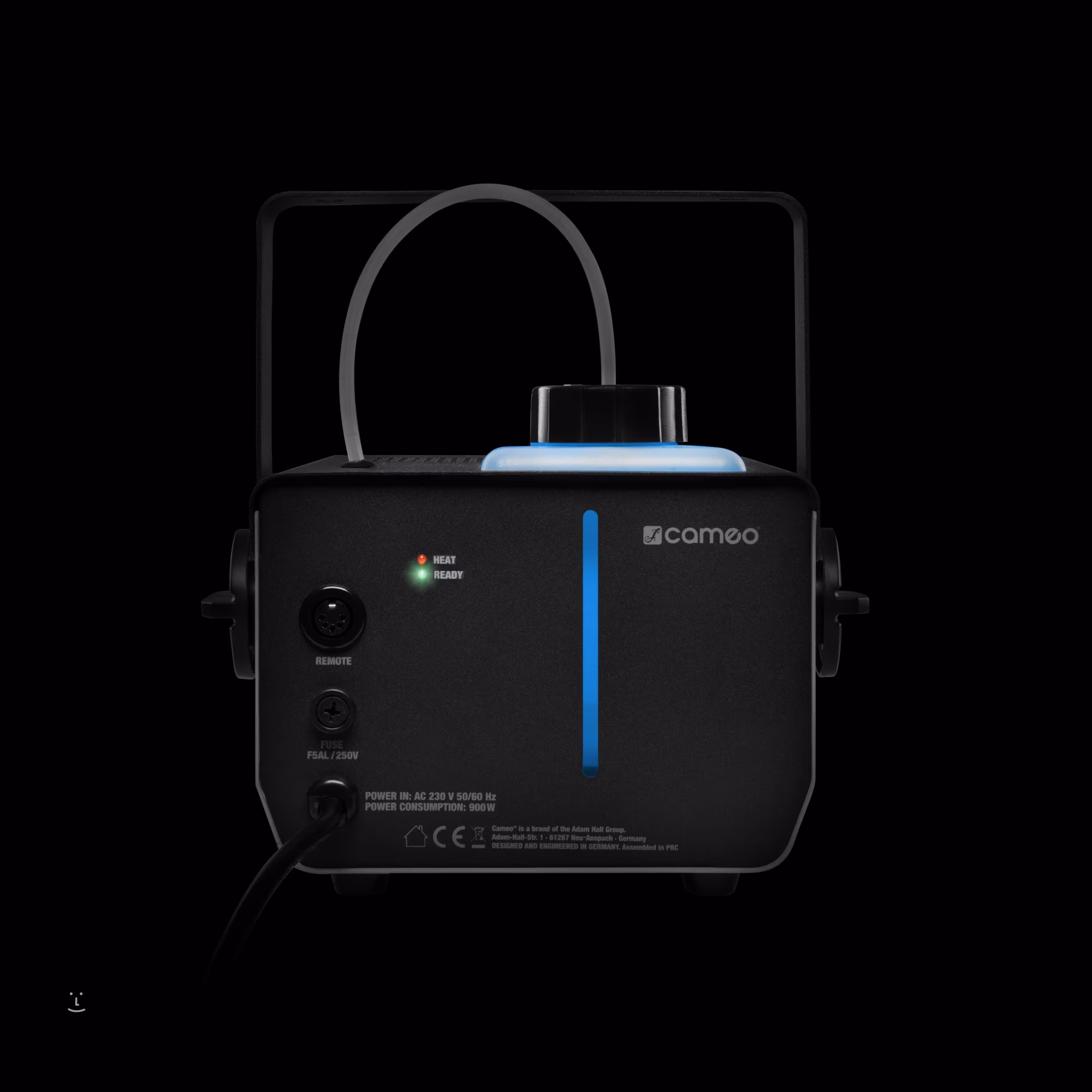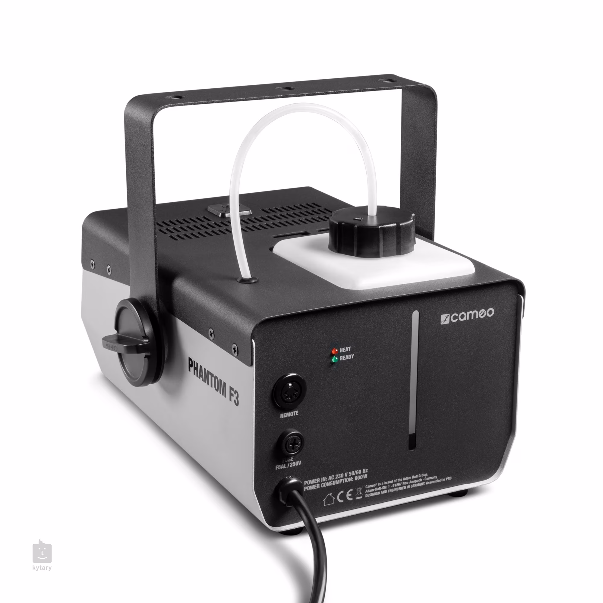 A CameoPhantom F3 egy professzionális ködképző, amely a nagy teljesítmény és a kompakt méret közötti arany középutat kínálja. Fűtőelemének teljesítménye 950 W, ami percenként körülbelül 240 m³ ködmennyiség előállítását teszi lehetővé. Körülbelül 3 percig tart, amíg a termelőt először üzemi hőmérsékletre melegíti, majd mindössze 8 másodpercig tart, amíg újra felmelegszik - így a rendezvény teljes időtartama alatt számíthat a zökkenőmentes, várakozásmentes működésre.