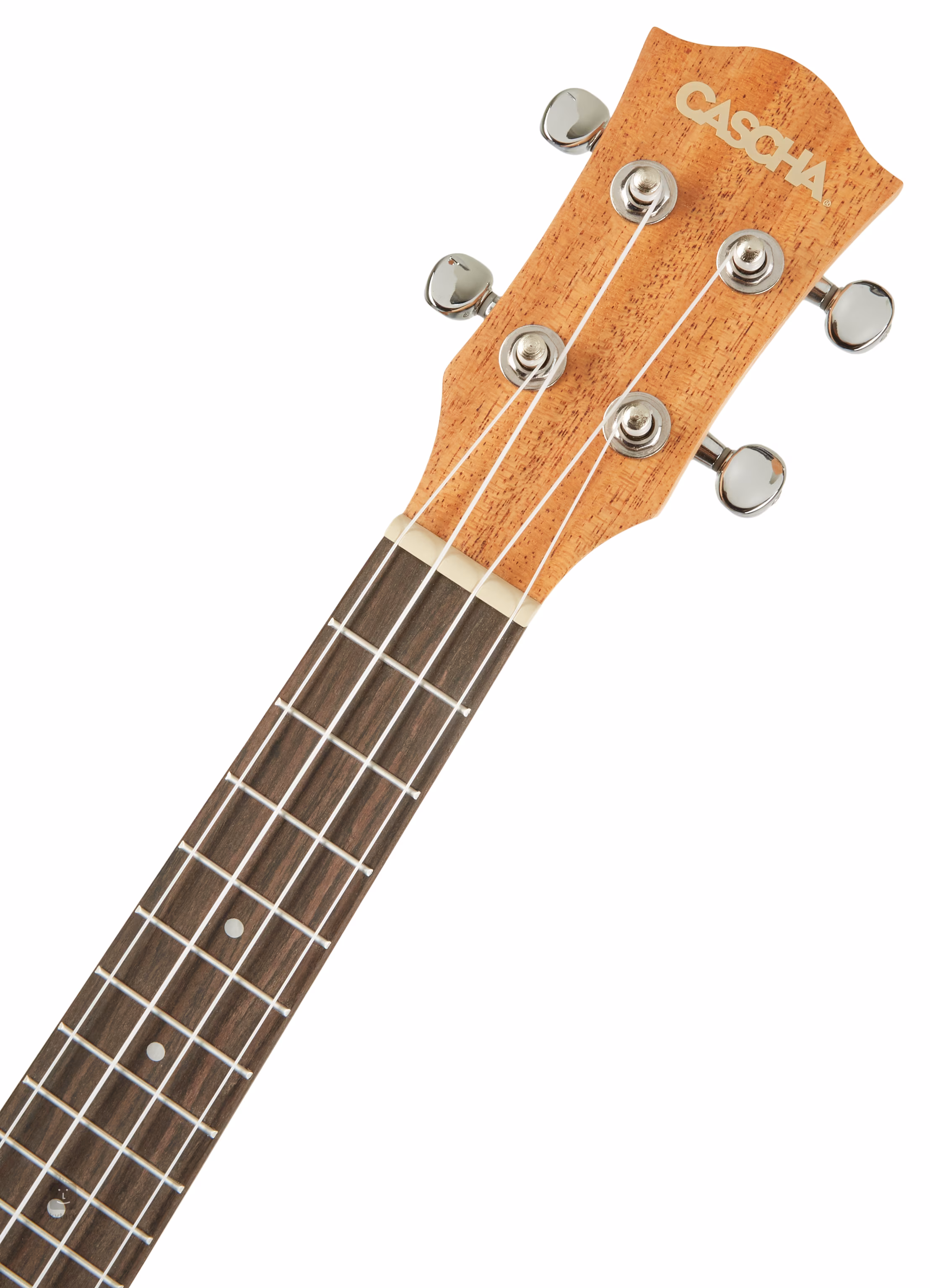 A Premium - Solid Top sorozatba tartozó Cascha koncert ukulele előlapja tömör lucfenyőből, a hátlap és az oldalak laminált mahagóniból készültek. A rózsafa fogólapot tizennyolc bund osztja. Felületén a pozíciós pontok megkönnyítik a tájékozódást.