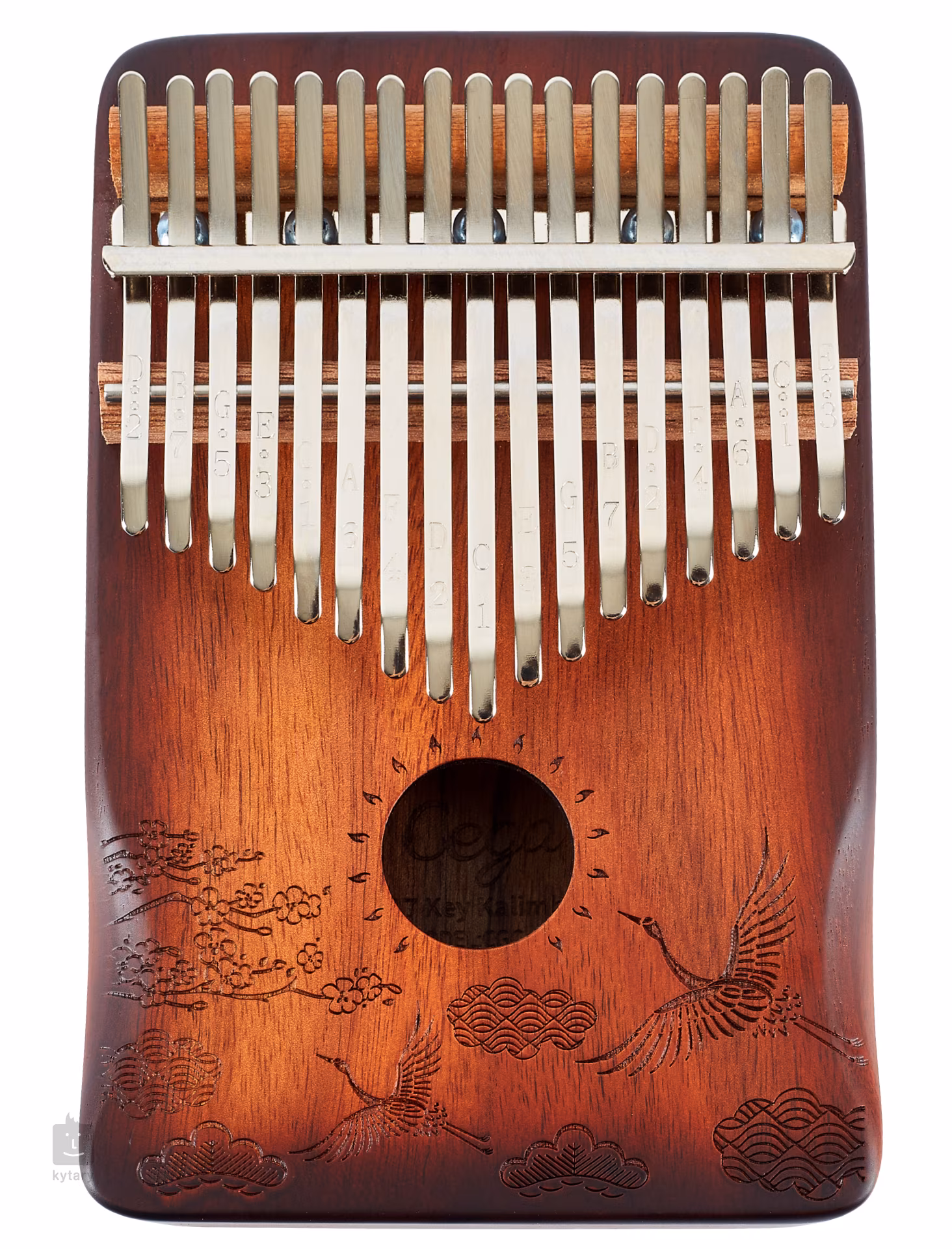 A kalimba egy egyedülálló dallamhangszer, amely egyedi és összetéveszthetetlen elemet ad a produkcióhoz vagy az élő előadáshoz. Használható kísérethez vagy szólójátékhoz. A Cega kalimbák kiváló minőségű, kizárólag természetes úton szárított fából készülnek, ami nagyszerű hangzási tulajdonságokat és maximális stabilitást biztosít. Ez a modell bevált mahagóni fából készült, és hanglyukkal rendelkezik, amely erősebbé és sűrűbbé teszi a hangszer hangzását. A szénacél billentyűk ezután tiszta és hangos, mégis kellemesen meleg hangot adnak a hangszernek. A billentyűk gravírozott hangszínekkel is rendelkeznek, ami különösen az új játékosok számára nyújt segítséget a tájékozódásban.