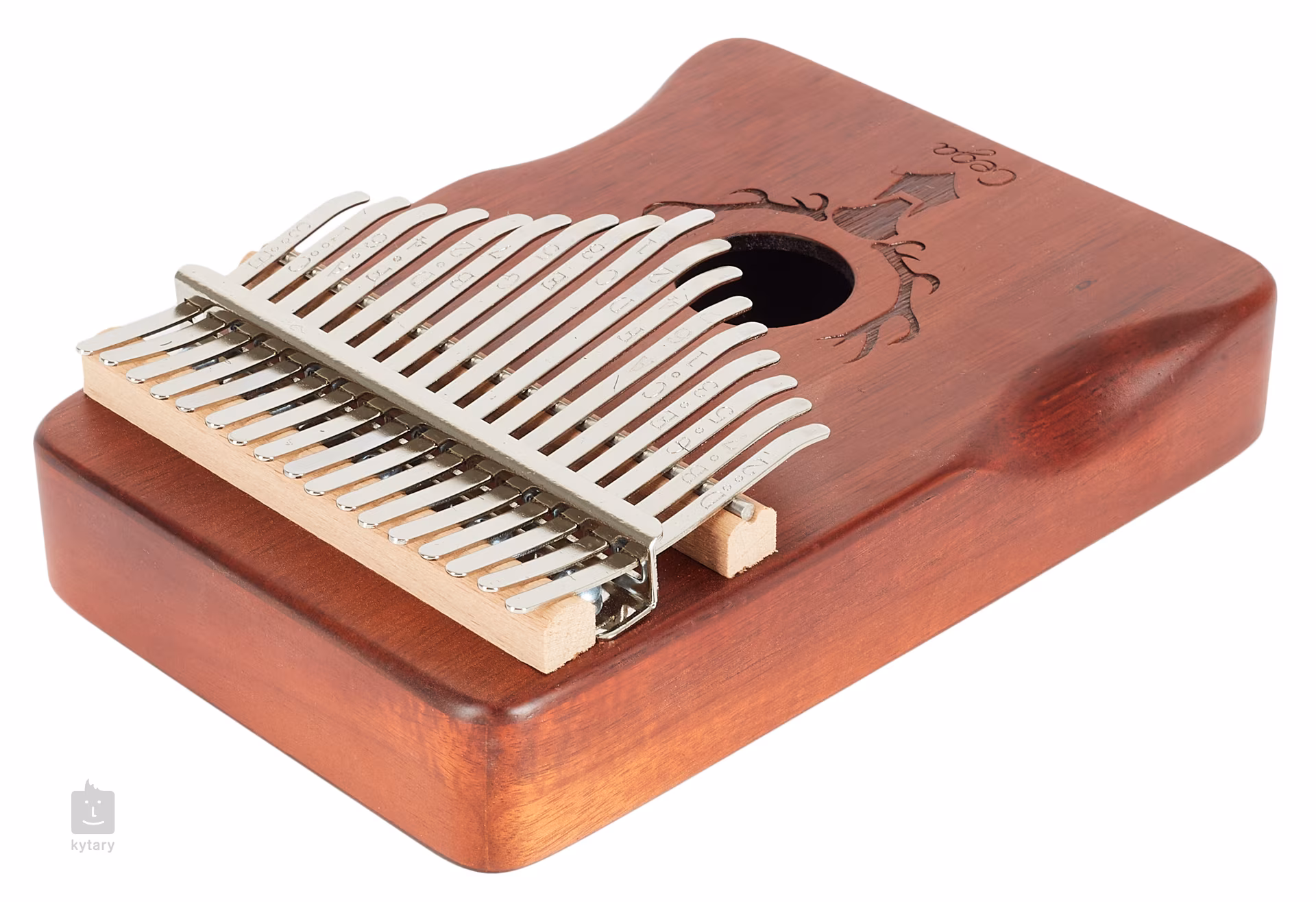 A kalimba egy egyedülálló dallamhangszer, amely egyedi és összetéveszthetetlen elemet ad a produkcióhoz vagy az élő előadáshoz. Kíséretként vagy szólójátékra is használható. A Cega kalimbák kiváló minőségű, csak természetes úton szárított fából készülnek, ami nagyszerű hangjellemzőket és maximális stabilitást biztosít. Ez a modell mahagóniból készült, és lézerrel égetett mintával díszített. A szénacél billentyűk ezután tiszta és hangos, mégis kellemesen meleg hangot adnak a hangszernek, amely ennél a modellnél a hanglyuknak köszönhetően tovább erősödik. A billentyűkön gravírozott hangjegyek is találhatók, amelyek különösen az új játékosok tájékozódását segítik. Az alján talál egy tekercset, amelyet a szíj rögzítésére használnak, de főként egy 6,3 mm-es jack csatlakozó bemenetét is, amely PA-rendszerhez vagy kombóhoz való csatlakoztatásra szolgál. Ez kibővíti a hangszer használatának lehetőségeit például színpadokon is.