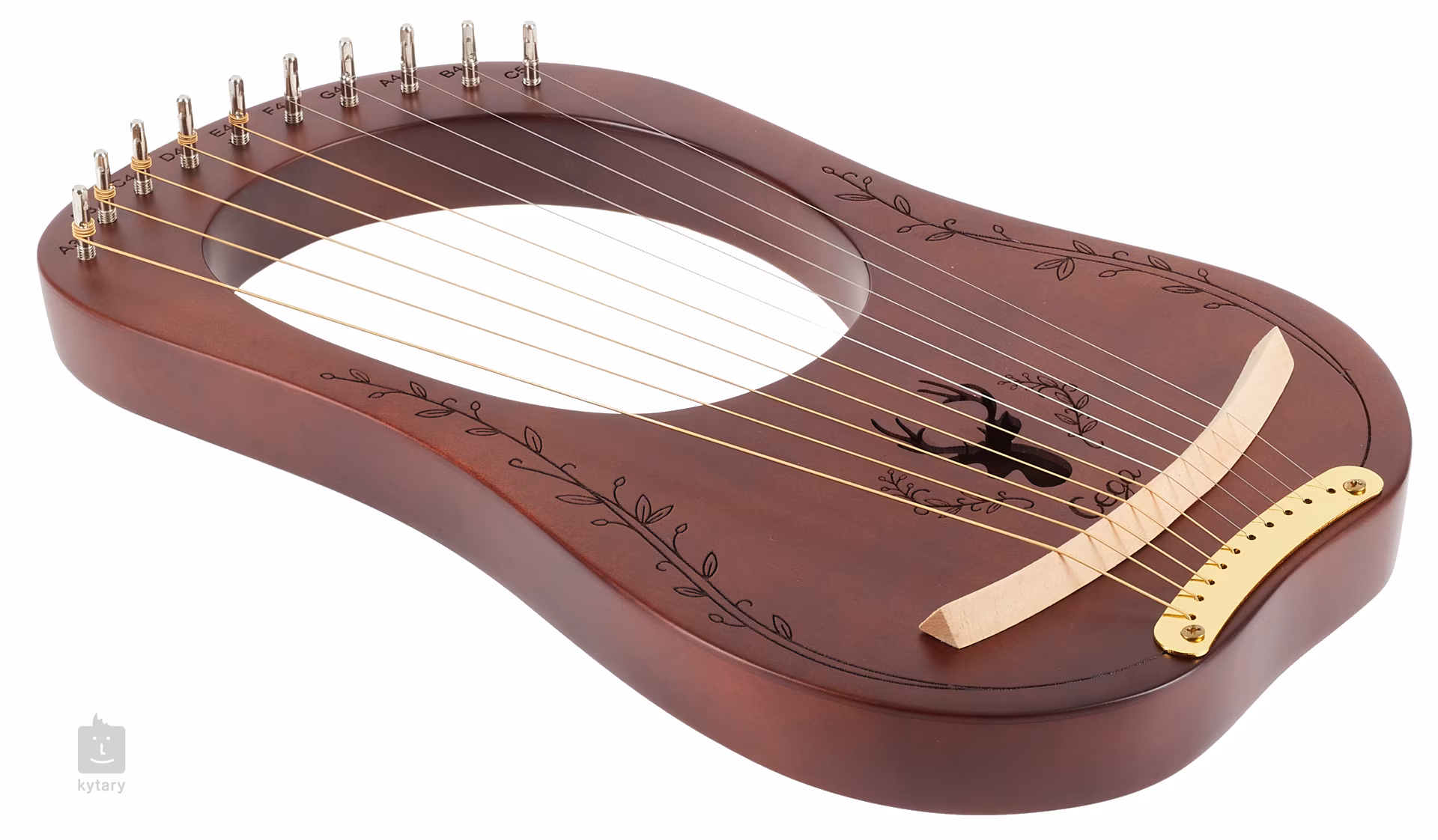 A Lyra LH10C kávé színű, tízhúros, és a hanglyuk körül szarvas alakú faragvány díszíti.