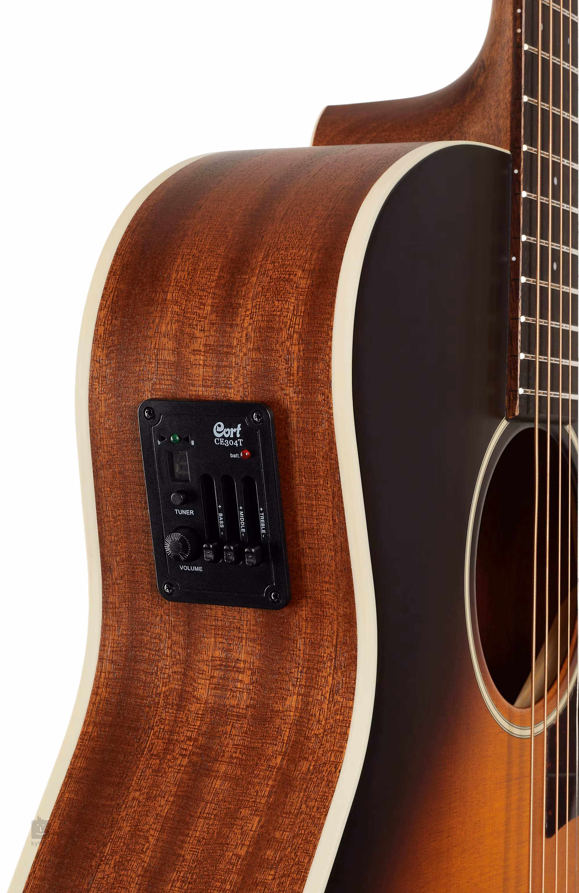 A hangfelvételről egy Cort CE304T előerősítő gondoskodik, háromsávos EQ-val és beépített hangolóval. A húrokat a cég öntvény mechanikájába és ovangkol fejlécébe szerelik. A stílusos kivitelezést elefántcsont rozetta és peremkötés, valamint teknőspáncél koptatóvédő emeli ki.