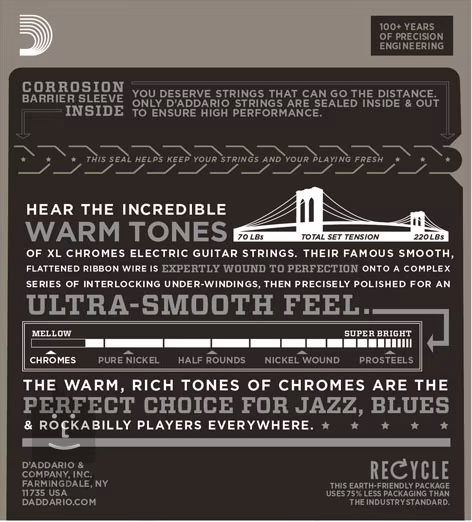 A D’addario XL Chromes elektromos gitárhúrok meleg, kerek hangzást kínálnak, amelyet főleg a jazz- és bluesgitárosok kedvelnek (többek között az amerikai bluesgitáros Gary Clark Jr. is ezeket használja). Ezek simított húrok, amelyek szinte semmilyen zajt nem keltenek játék közben, és finom érzést nyújtanak. Alapjuk egy hatszögletű acélmag, amely tökéletes intonációt, hosszú élettartamot és konzisztens játékérzetet biztosít. A tekercselt húrok finom acélhuzallal vannak bevonva, simított felülettel, amely hangzásában még jobban hangsúlyozza a végső hang finomságát és lágyaságát. Ideális választás minden jazz- és bluesgitáros számára.