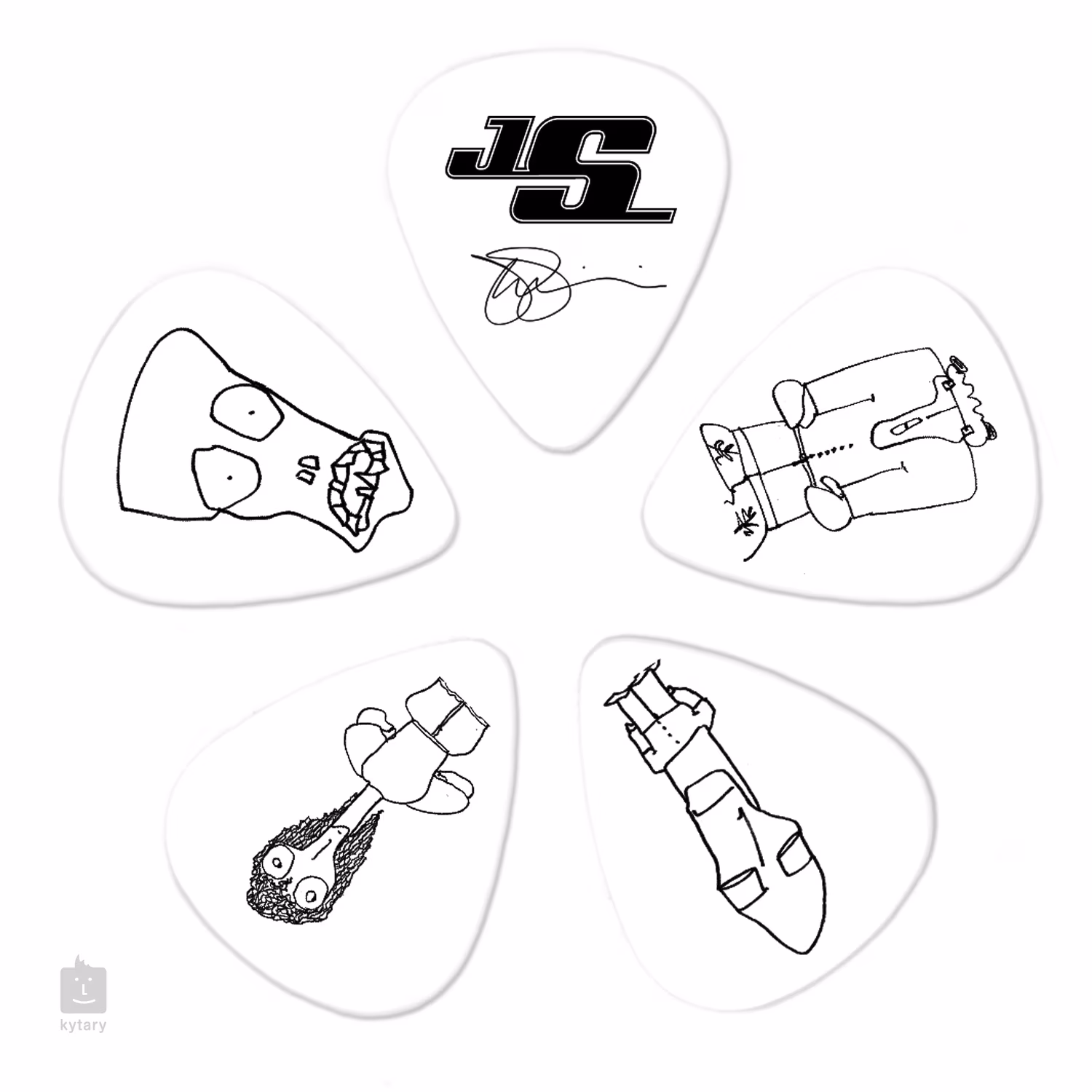 Joe Satriani gitármágus által kézzel rajzolt motívumokkal ellátott fehér celluloid pengetőkészlet. A csomag tíz pengetőt tartalmaz, mindegyik egyedi motívummal.