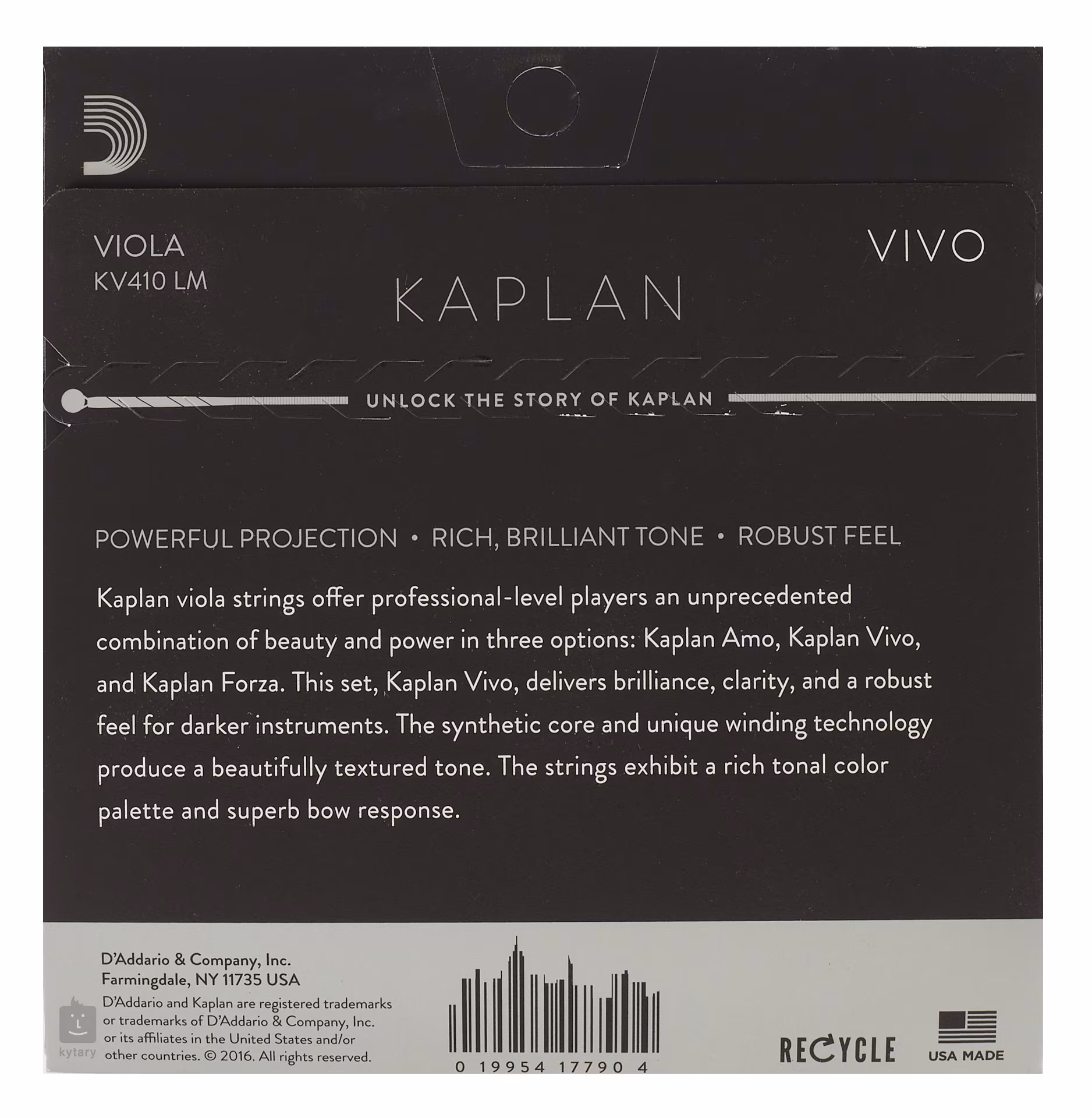 A Kaplan Vivo professzionális műszálas húrjai kiválóan reagálnak a vonójátékra, és tiszta, tiszta hangzást produkálnak, amely ideális a sötétebb hangkarakterisztikájú hangszerekkel való kombináláshoz.