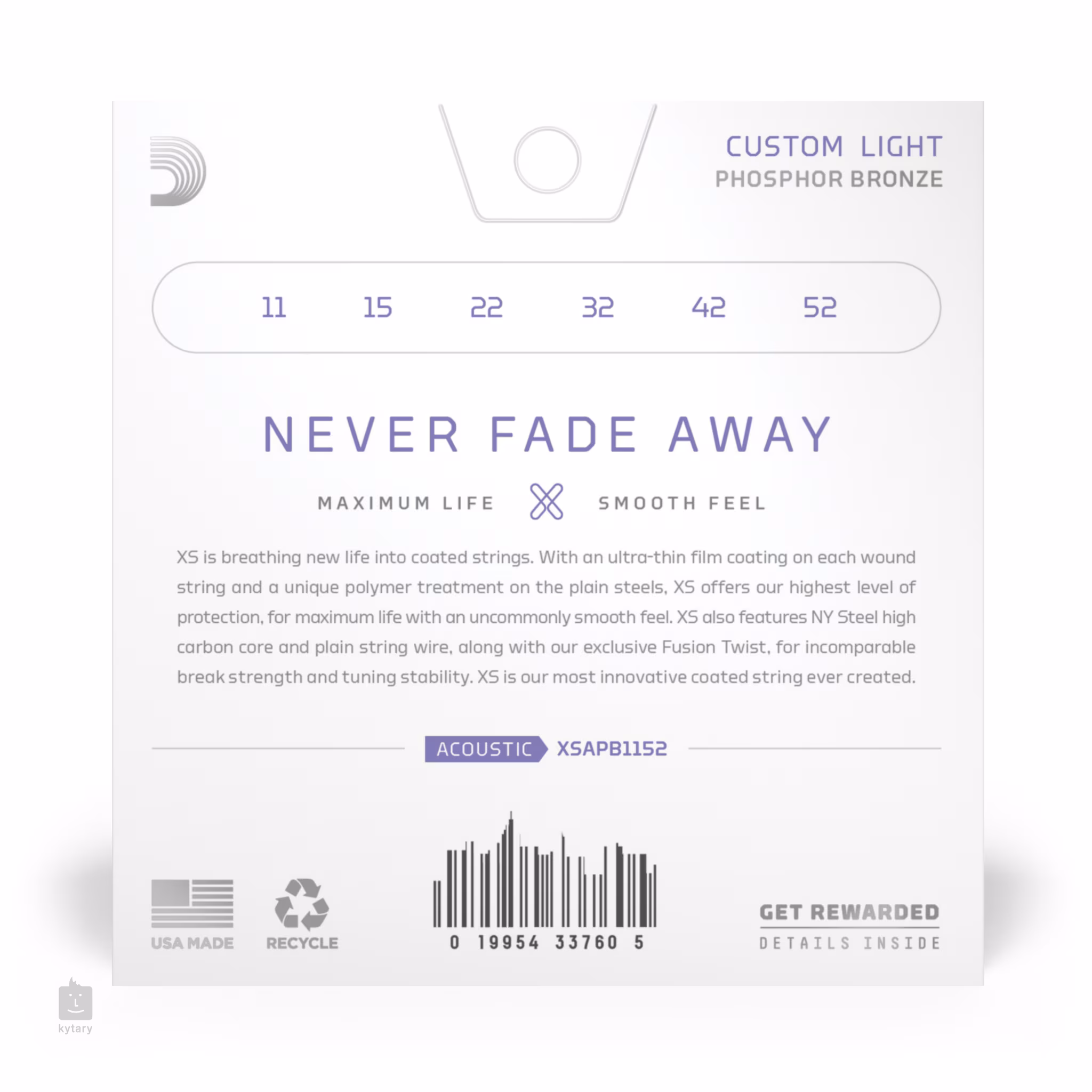 A D'Addario cég XS sorozatú húrai technológiai áttörést jelentenek a bevont húrok területén, és a világhírű cég katalógusában található termékek közül a csúcsminőséget képviselik. Ezek a húrok ötvözik az XT sorozat legjobb tulajdonságait, de még egy lépéssel tovább emelik a lécet. Hihetetlenül vékony bevonatuknak köszönhetően páratlan élettartammal és kellemesen sima felülettel rendelkeznek, miközben semmit sem vesznek el a D'Addario húrok híres kiváló hangzási tulajdonságaiból. A magas szén-dioxid-tartalmú hatszögletű acélmag és a foszforbronz tekercselésnek köszönhetően meleg és erőteljes hangzást kínálnak, kiegyensúlyozott frekvenciákkal, hosszú sustainnel és kiváló dinamikával. Ugyanakkor kiváló hangstabilitással és nagy ellenállással büszkélkedhetnek. Egyszerűen csúcsminőségű húrok, amelyek nagyon sokáig kitartanak.