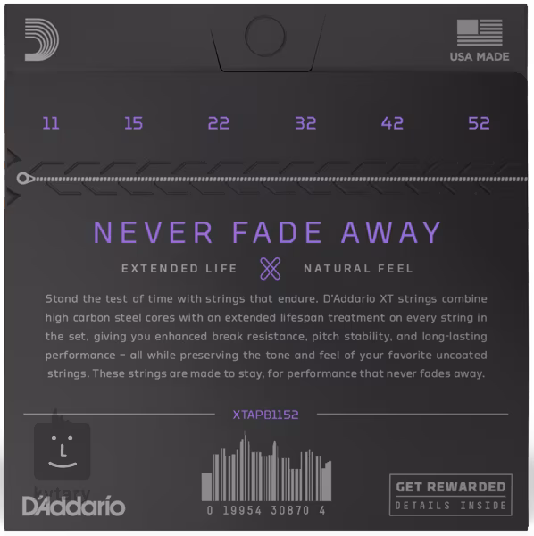 A D'Addario XT húrok akár négyszer tovább tartanak, mint a hagyományos, kezeletlen húrok, anélkül, hogy feláldoznák a hangminőséget vagy a játékérzetet. Ugyanakkor nagyobb repedésállóságot és jobb hangolási stabilitást biztosítanak. A magas szén-dioxid-tartalmú hatszögletű acélmag és a foszforbronz tekercselésnek köszönhetően meleg és erőteljes hangzást kínálnak, kiegyensúlyozott frekvenciákkal, hosszú sustainnel és kiváló dinamikával. Az egyes húrok korróziógátló csomagolása biztosítja, hogy ugyanolyan frissen érkezzenek meg hozzád, mint amikor elhagyták a New York-i gyárat.