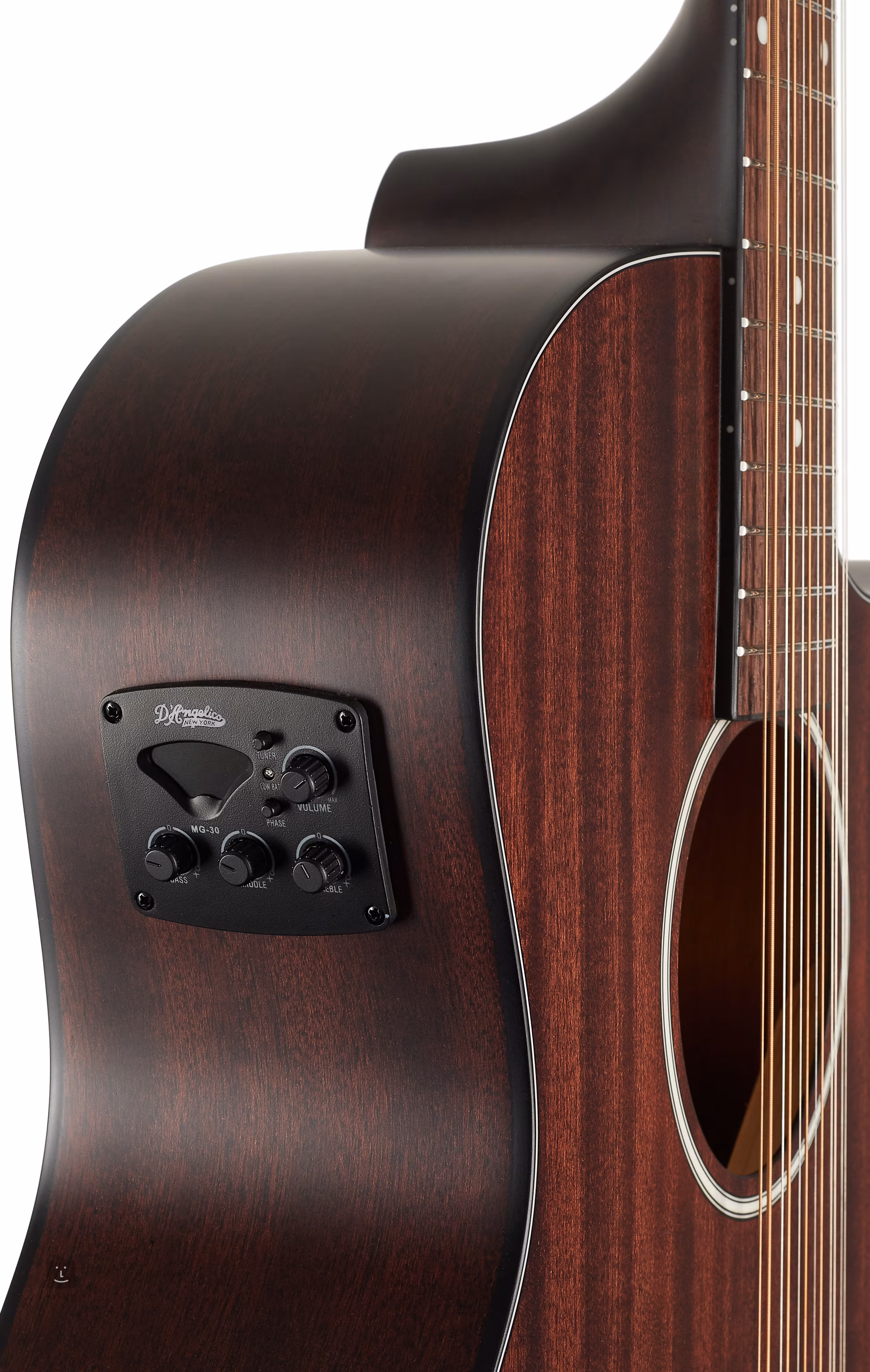 A hangrendszerről egy D'Angelico MG-30 előerősítő gondoskodik, a gitár nyakába épített integrált hangolóval.