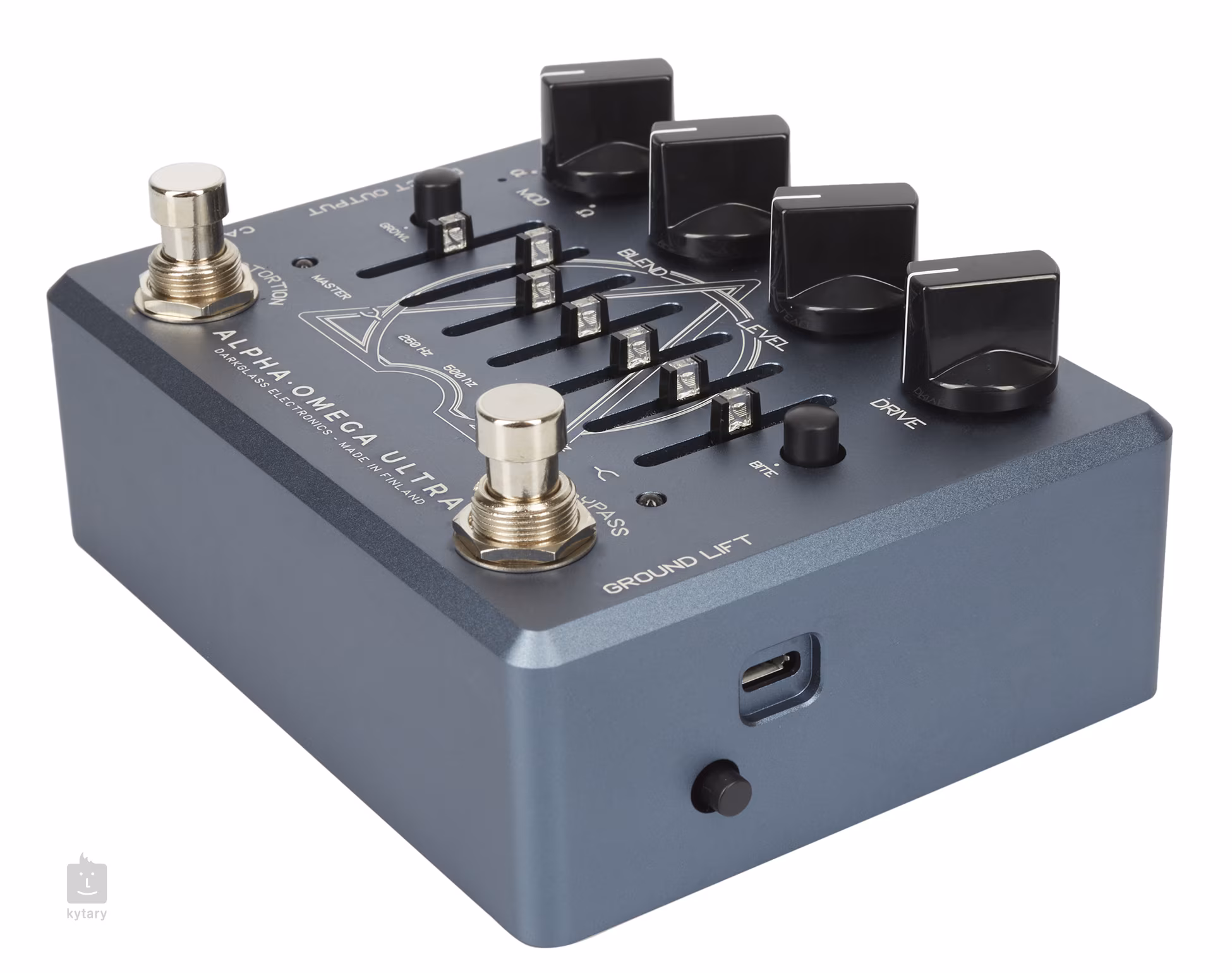 A népszerű Alpha-Omega pedál evolúciója az Ultra modell formájában a finn Darkglass Electronics butik cég legsokoldalúbb basszus effektje és előerősítője. A gyártó termékei olyan zenekarok játékosai körében népszerűek, mint a Cannibal Corpse, Faith No More, Jamiroquai, Lamb of God, The Strokes, Suicidal Tendencies, Tony Levin és Devin Townsend. Az effekt két különböző típusú torzítással rendelkezik Alpha és Omega. Míg az Alpha hangzás határozottabb és feszesebb, addig az Omega annak nyers és brutális alternatívája. Mindkét áramkör kiválasztható vagy keverhető a Mod szabályzóval, és tetszőleges arányban keverhető. Ez a változat tovább bővült egy AUX-al, ahová külső hangforrást csatlakoztathat.