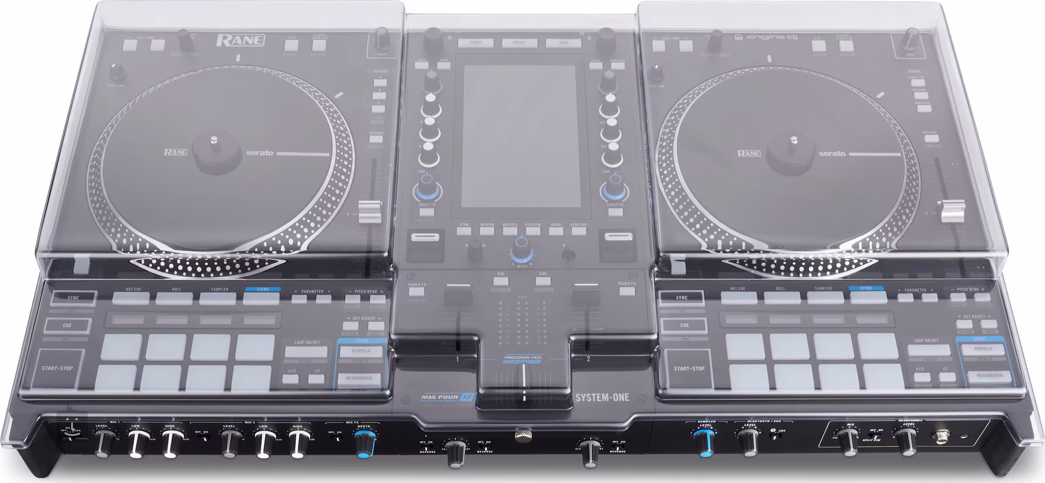 A Decksaver műanyag burkolatok minden fontos részét lefedik a felszerelésnek, pontosan az adott modellekhez vannak kialakítva, és nyílásokkal rendelkeznek a csatlakozók számára, így minden csatlakoztatva maradhat. A burkolatok kiváló minőségű, átlátszó műanyagból készülnek.