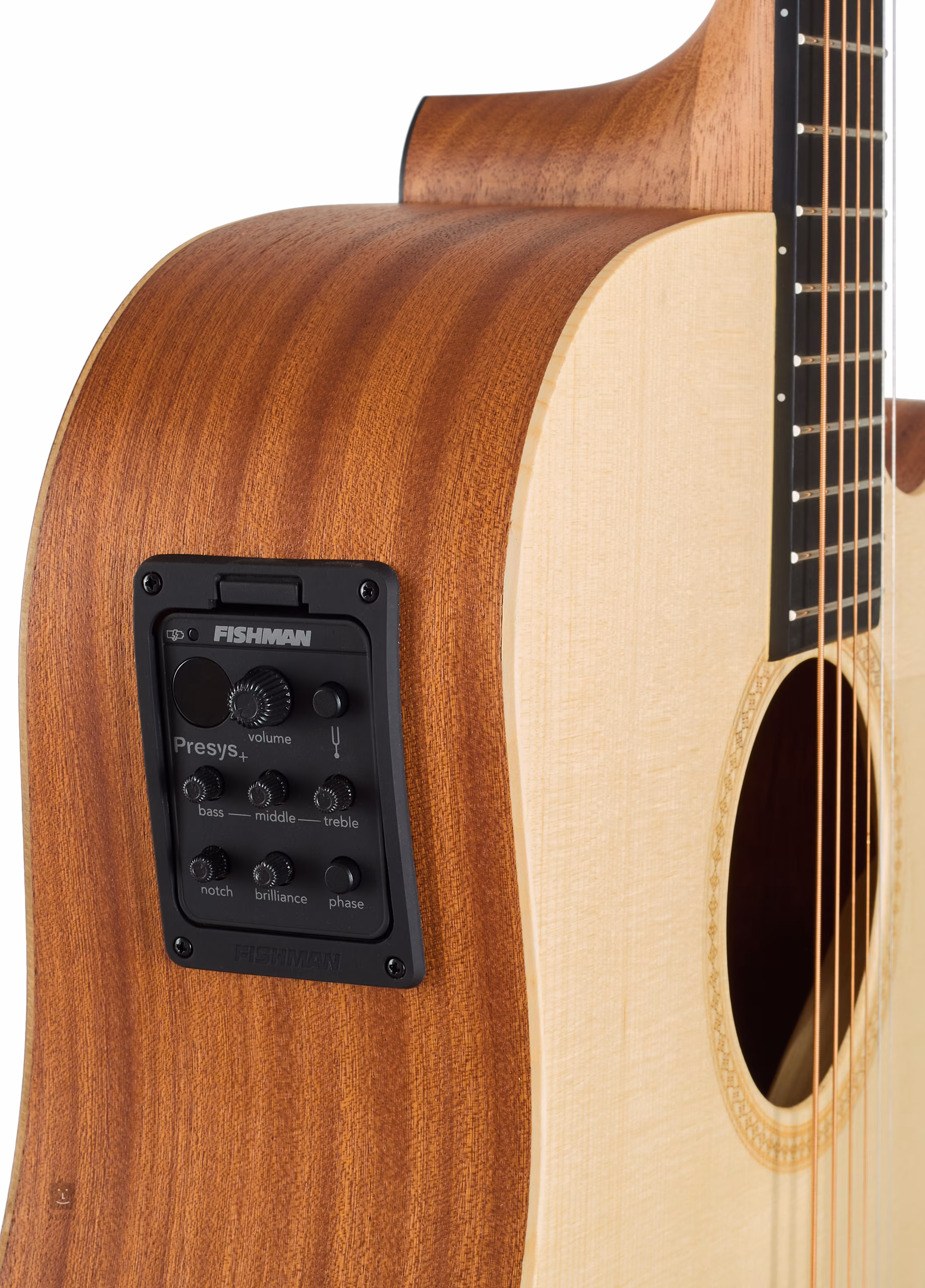 A Fishman Presys + előerősítő a gitár testében és a Fishman Sonicore aljzat alatti hangszedő ideális megoldást kínálnak az akusztikus gitárok hangosításához. Az előerősítő hangerő-szabályzóval, beépített hangolóval LED-kijelzővel, háromsávos ekvalizerrel, Brilliance és Notch filter szabályzóval, valamint Phase funkcióval rendelkezik a fázis megfordításához és a nem kívánt visszacsatolási effektus kiszűréséhez.