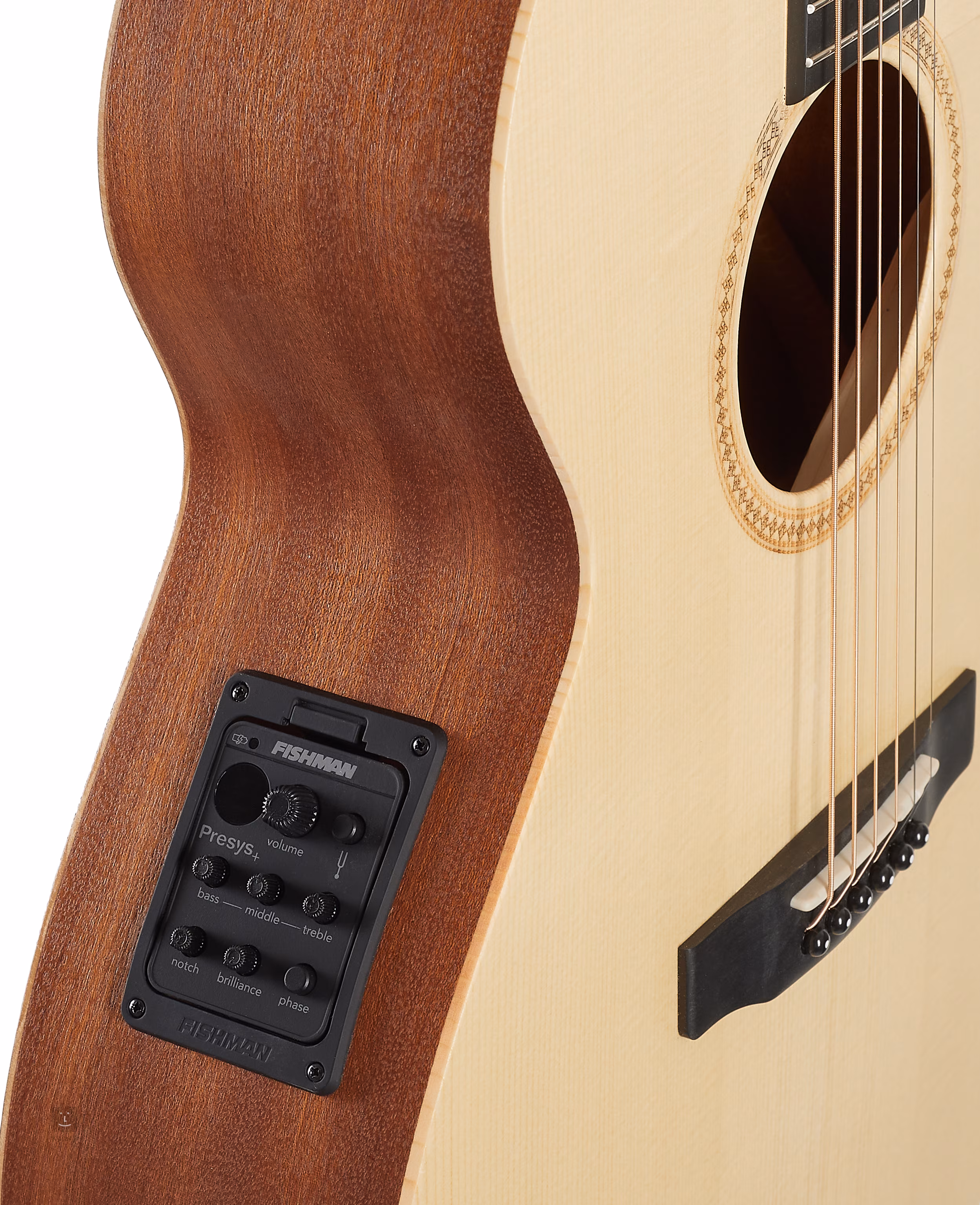 A gitár hátuljában található Fishman Presys+ előerősítő a Fishman Sonicore hangszedővel együtt ideális megoldást jelent az akusztikus gitárok számára. Az előerősítő rendelkezik hangerőszabályzóval, beépített hangolóval LED kijelzővel, háromsávos EQ-val, amelyet Brilliance és Notch szűrőszabályozók egészítenek ki, valamint Phase funkcióval a fázis megfordítására és a nem kívánt visszacsatolási hatások kiszűrésére.