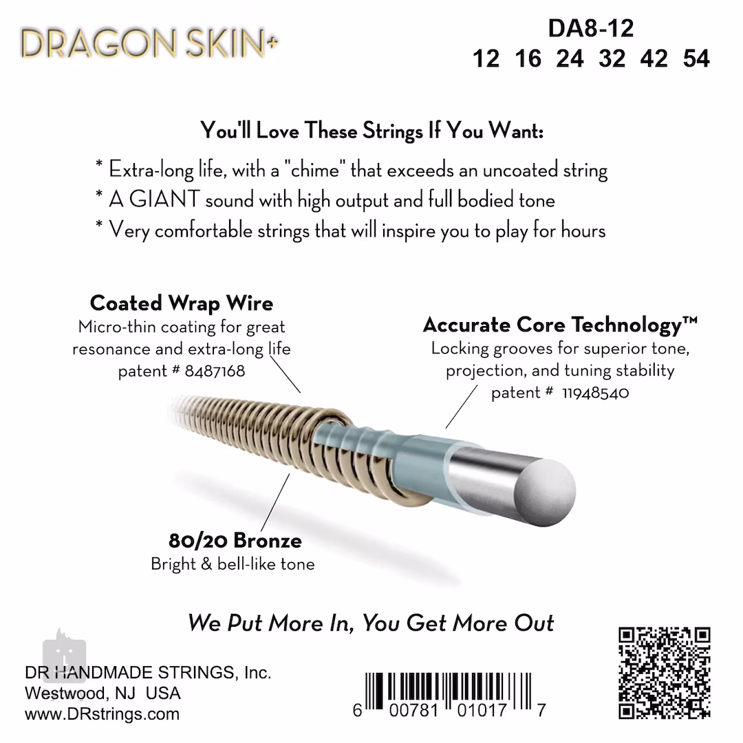 A DR cég Dragon Skin+ húrai rendkívül erős és frekvenciában kiegyensúlyozott hangzással tűnnek ki. A speciális korróziógátló bevonat ellenállóságot és rendkívül hosszú élettartamot biztosít számukra. Ezen felül a szabadalmaztatott Accurate Core technológiát alkalmazzák, amely a húr magján található finom barázdáknak köszönhetően biztosítja a tekercselt huzal szilárd rögzítését, és ezáltal stabil hangolást és kivételesen átható hangzást. A Dragon Skin+ húrokat olyan világszerte vezető gitárgyártók használják, mint a Godin, az Ovation vagy a Faith. Ez a szett 80/20 bronzból készül, amely tiszta és csengő hangzást biztosít.