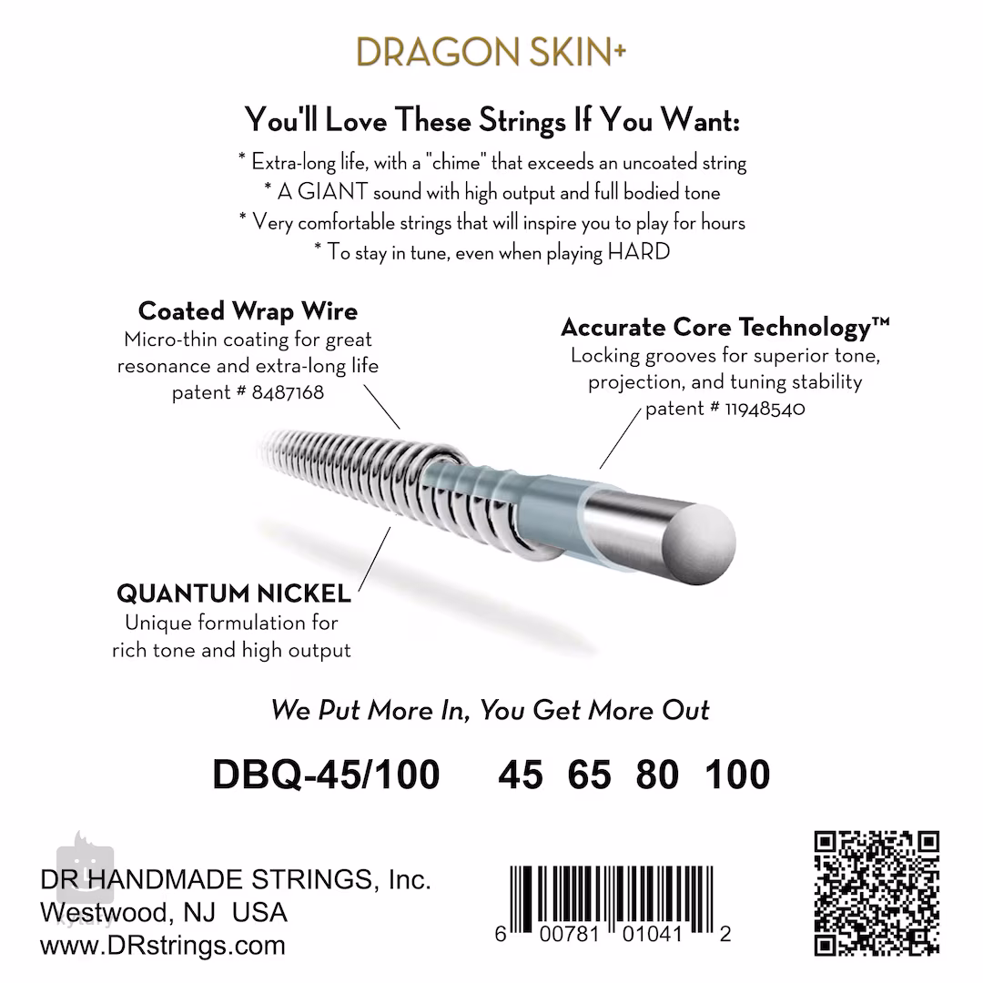 A DR cég Dragon Skin+ basszusgitárhúrai rendkívül erőteljes és frekvenciában kiegyensúlyozott hangzással tűnnek ki. A korrózió ellen védő speciális bevonat ellenállóságot és rendkívül hosszú élettartamot biztosít számukra. Ezen felül a szabadalmaztatott Accurate Core technológiát alkalmazzák, amely a húr magján található finom barázdáknak köszönhetően biztosítja a tekercselt huzal szilárd rögzítését, és ezáltal a stabil hangolást. Ez a szett nikkel bevonattal rendelkezik, amely gazdag és erőteljes hangzást biztosít a húroknak.