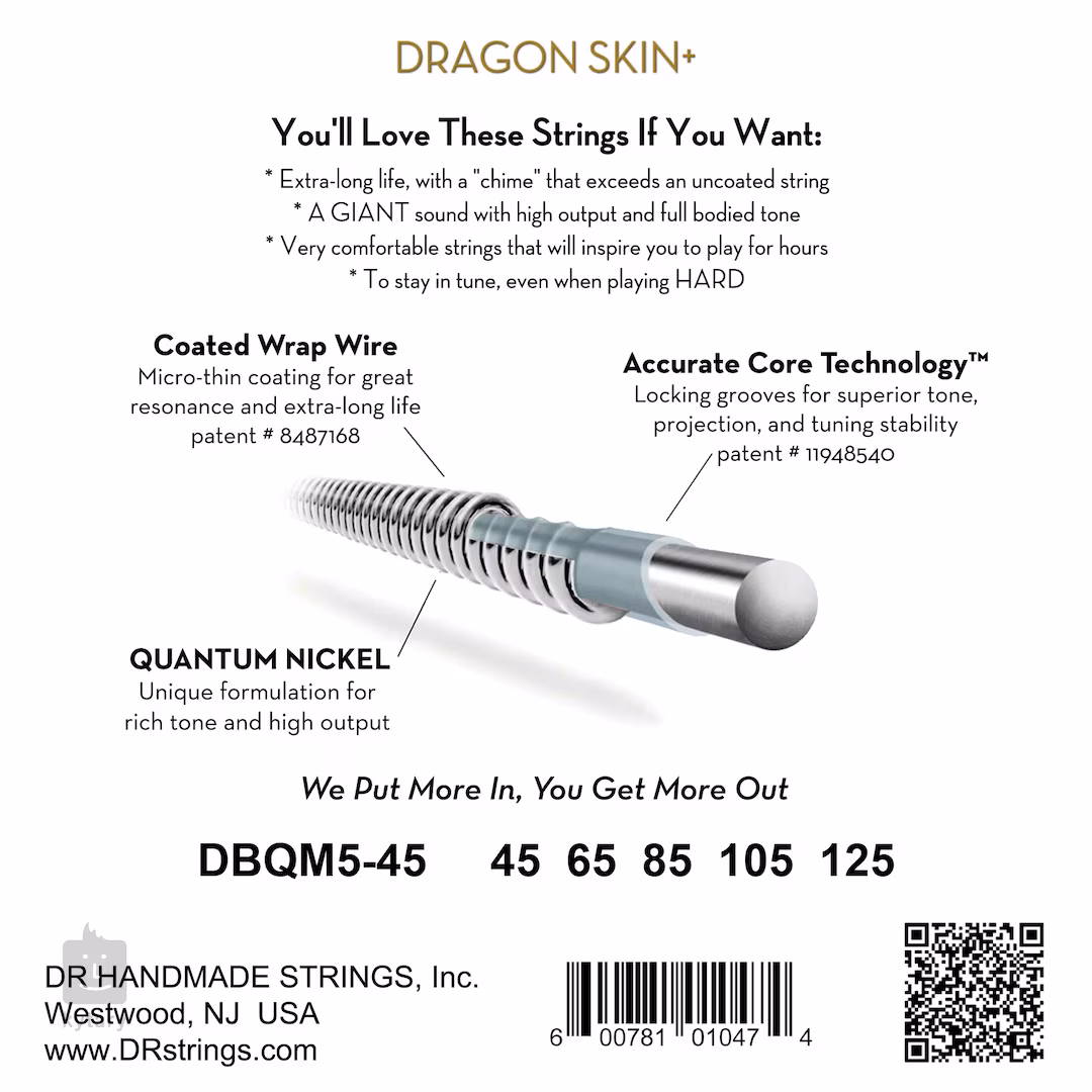 A DRDragon Skin+ basszushúrok nagyon erős és frekvenciakiegyensúlyozott hangzással rendelkeznek. A speciális korróziógátló bevonat tartósságot és extra hosszú élettartamot biztosít nekik. Emellett a szabadalmaztatott Accurate Core technológiát alkalmazzák, amely a húr magján található finom barázdáknak köszönhetően biztos fogást biztosít a felcsévélt huzalon, és ezáltal stabil hangolást.