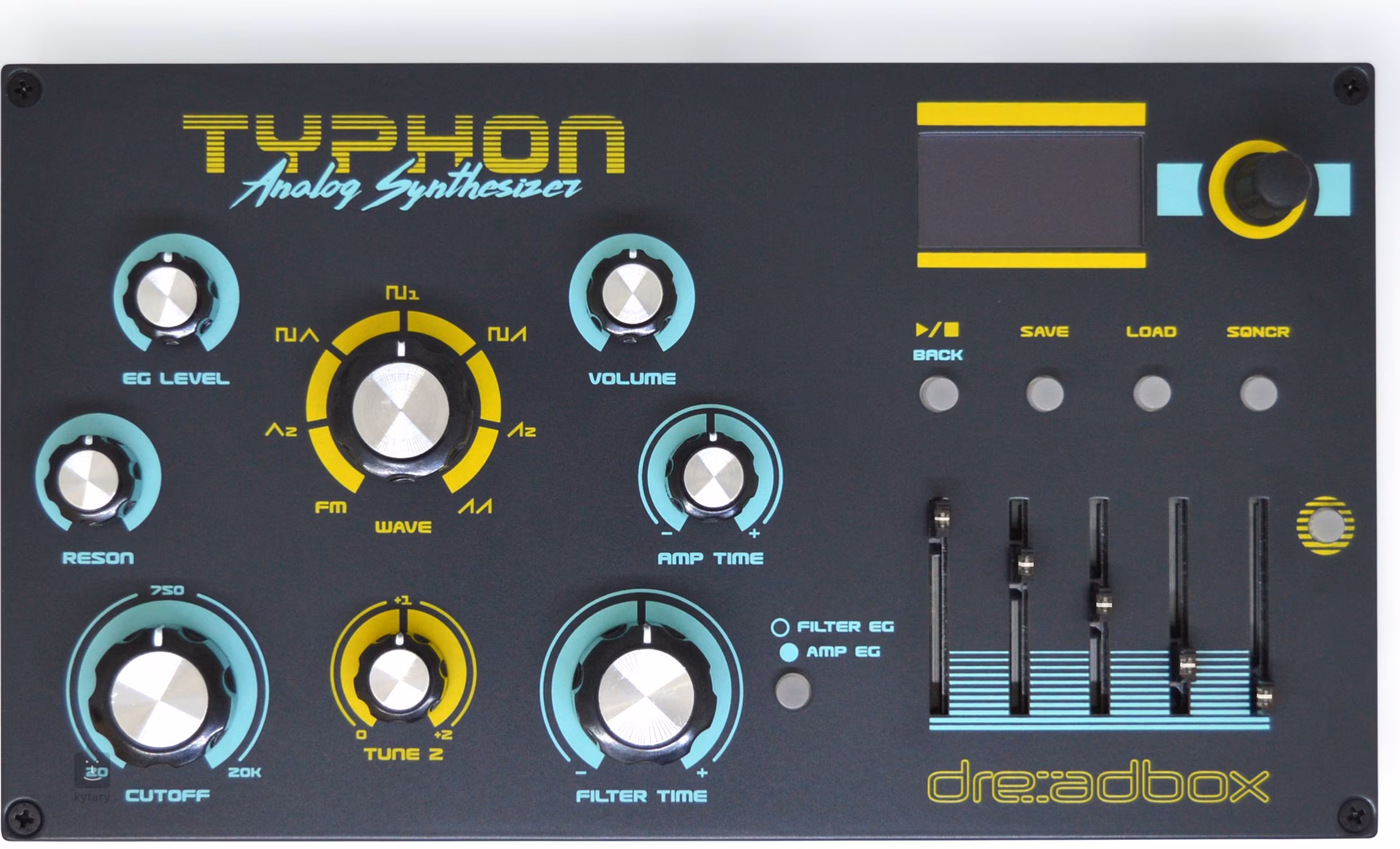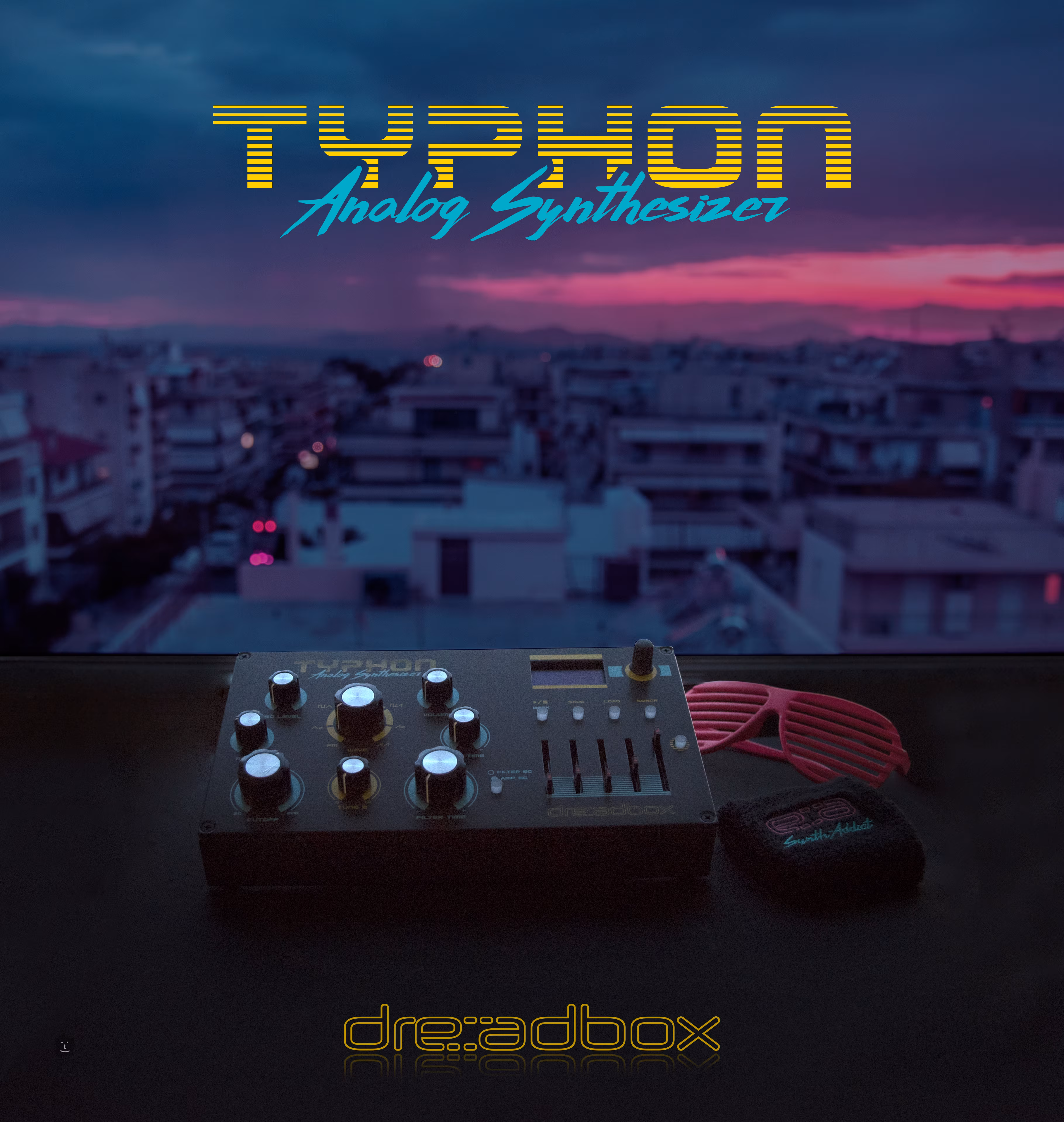 A Dreadbox Typhon egy vonzó szintetizátor, amelyet a legnagyobb gondossággal és szeretettel készítettek, hogy nagyszerűen szóljon, könnyen hordozható és megfizethető legyen. Analóg áramkörrel rendelkezik, két klasszikus oszcillátorral, négyfázisú aluláteresztő szűrővel, komplex modulációs útvonalvezetéssel, 256 előbeállítással és egy akár 32 hangjegyű szekvencerrel. Tizenkét DSP-effekt, például Distortion, Bit Crusher, Chorus, Flanger, Delay, Reverb és más effektek egyikét adhatja hozzá a zeneszámokhoz és ütemekhez.