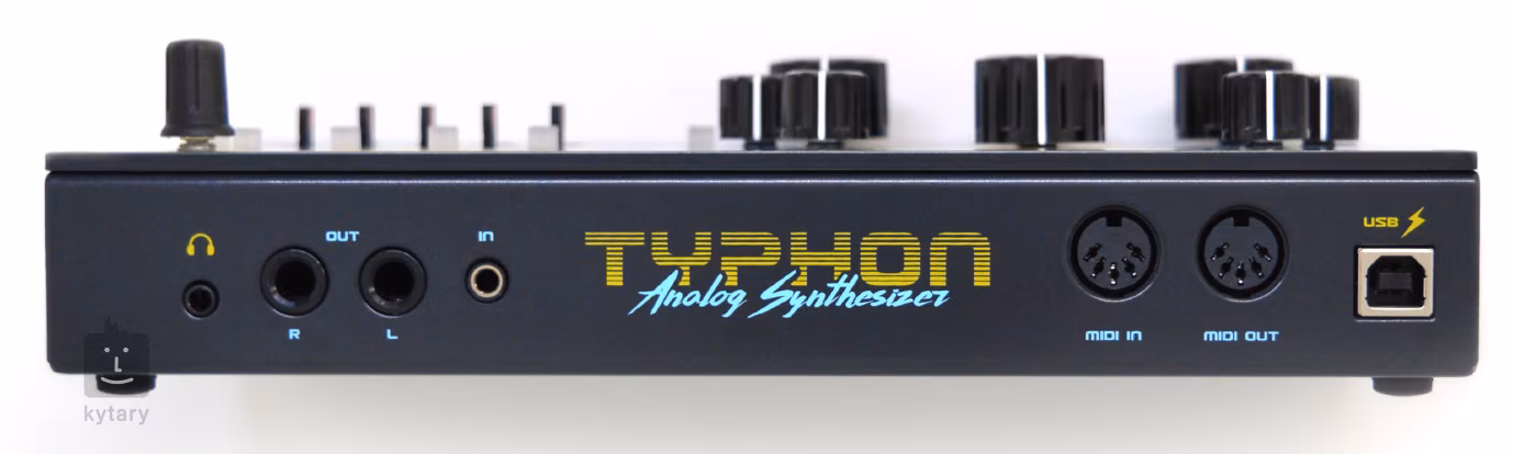 Az egész Typhon retro nyolcvanas évekbeli dizájnnal rendelkezik, de jellemzői és funkciói garantáltan megfelelnek a mai szabványoknak és trendeknek. A fő vezérlőpanel gombokat, kapcsolókat, öt mozgatható fadert és egy áttekinthető kijelzőt tartalmaz a könnyű beállítás érdekében. A hátsó panel ezután MIDI-csatlakozási lehetőséget, sztereó hangszóró kimenetet, analóg bemenetet hangszer vagy lejátszó számára, valamint fejhallgató kimenetet kínál a részletes monitorozáshoz. Az USB-portot magának az eszköznek az áramellátására, az akkumulátor akár 60 órás üzemidővel történő feltöltésére és a szintetizátor beállításainak kezelésére használják.