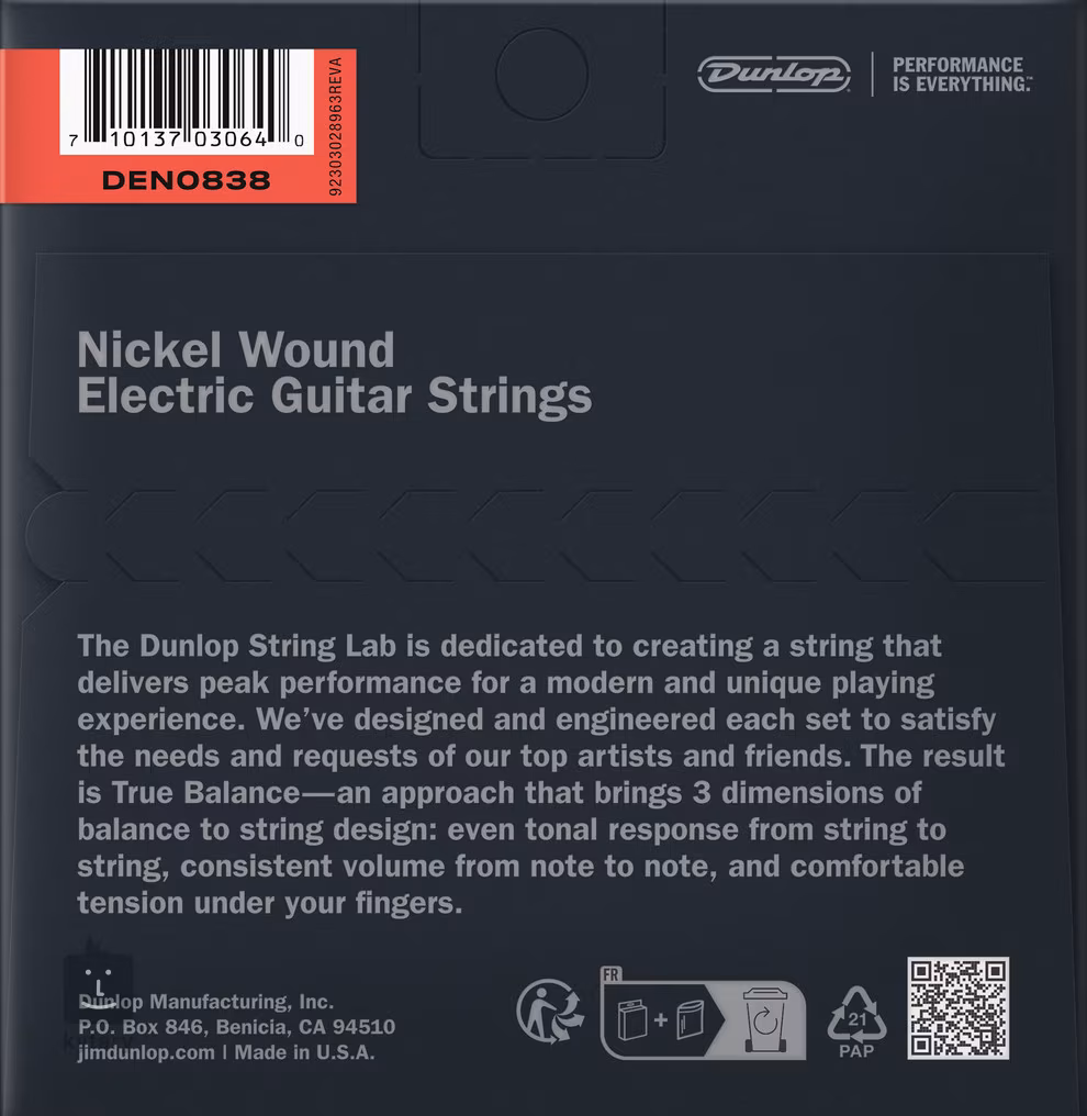 A DunlopNickel Wound sorozatú elektromos gitárhúrok a kaliforniai Benicia városában készülnek, ahol kiváló receptjük van a precízen megmunkált, a legjobb minőségű anyagokból készült húrok gyártására. Nikkelbevonatú acélból vannak tekercselve, hangzásuk pedig frekvenciailag kiegyensúlyozott, ami szinte minden zenei műfajban jól használható. Akár rockot, popot, metált, bluest vagy countryt játszol, ezek a húrok garantáltan nem fognak cserben hagyni. Ugyanakkor kiemelkednek szilárdságukkal, rugalmasságukkal és kényelmes játékukkal. A húrok VCI Fresh Technology technológiával vannak csomagolva, így biztos lehetsz benne, hogy ugyanolyan frissek lesznek, mint a gyártásuk napján.